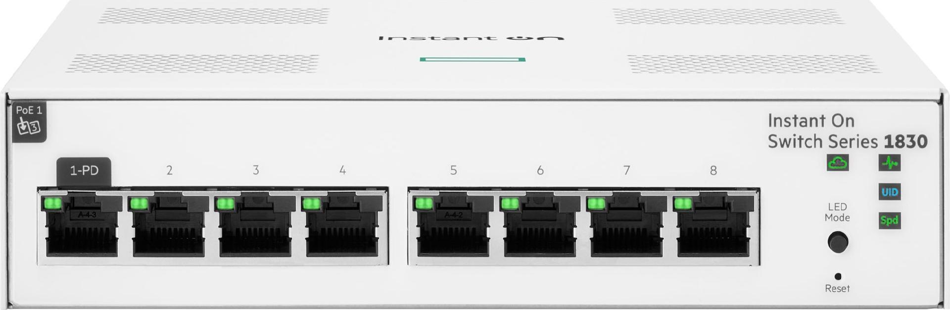 HPE Networking Instant On Switch 1830-8G, 8 Ports, 8x 1G RJ45 Ports, Stromversorgung über inkludiertes externes Netzteil oder alternativ über PoE Upstream Port möglich, Managebar (IOn App, Browser & SNMP), Lüfterlos (JL810A#'ABB)