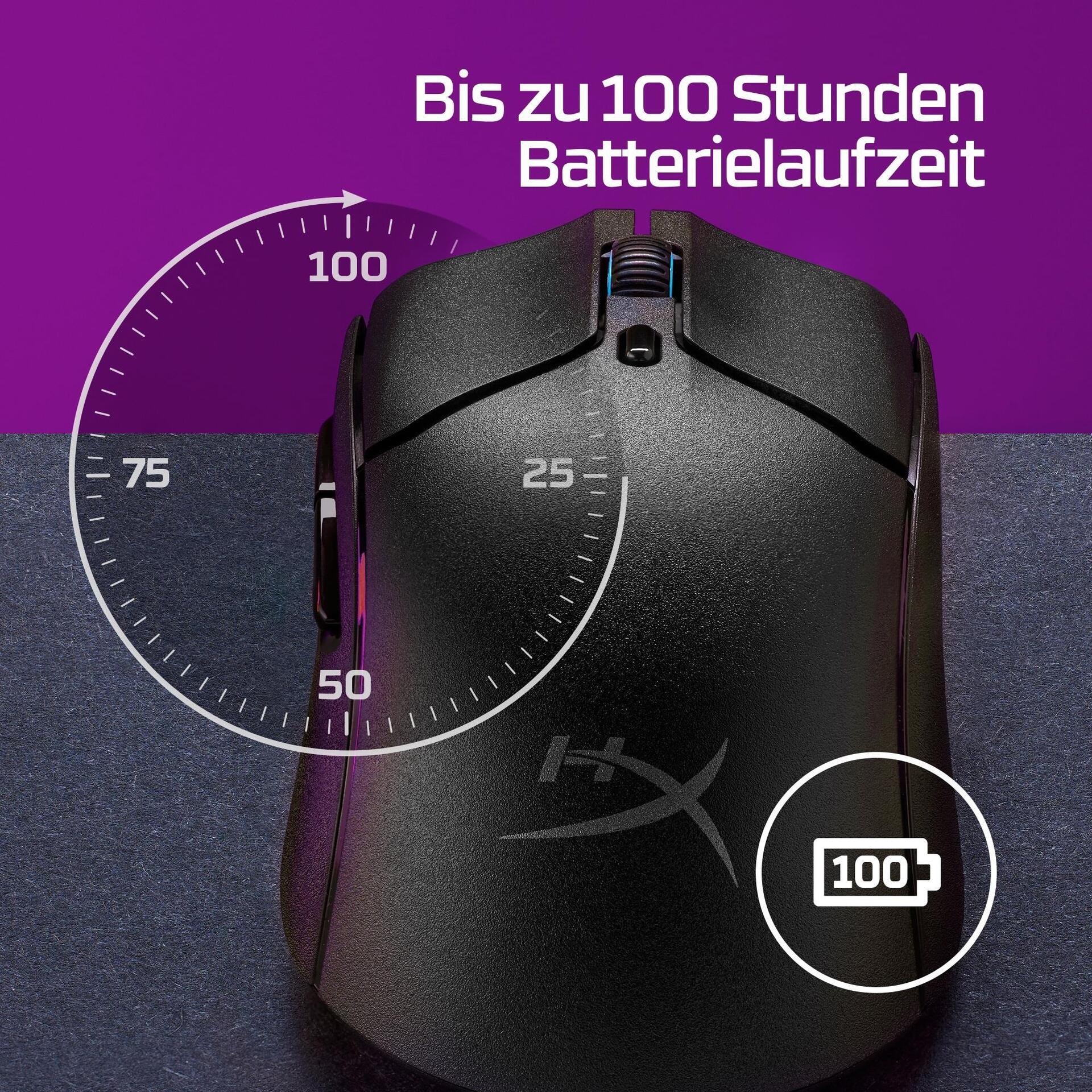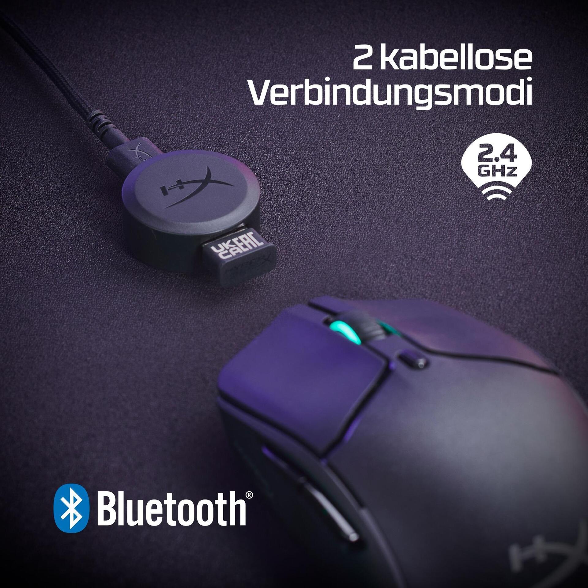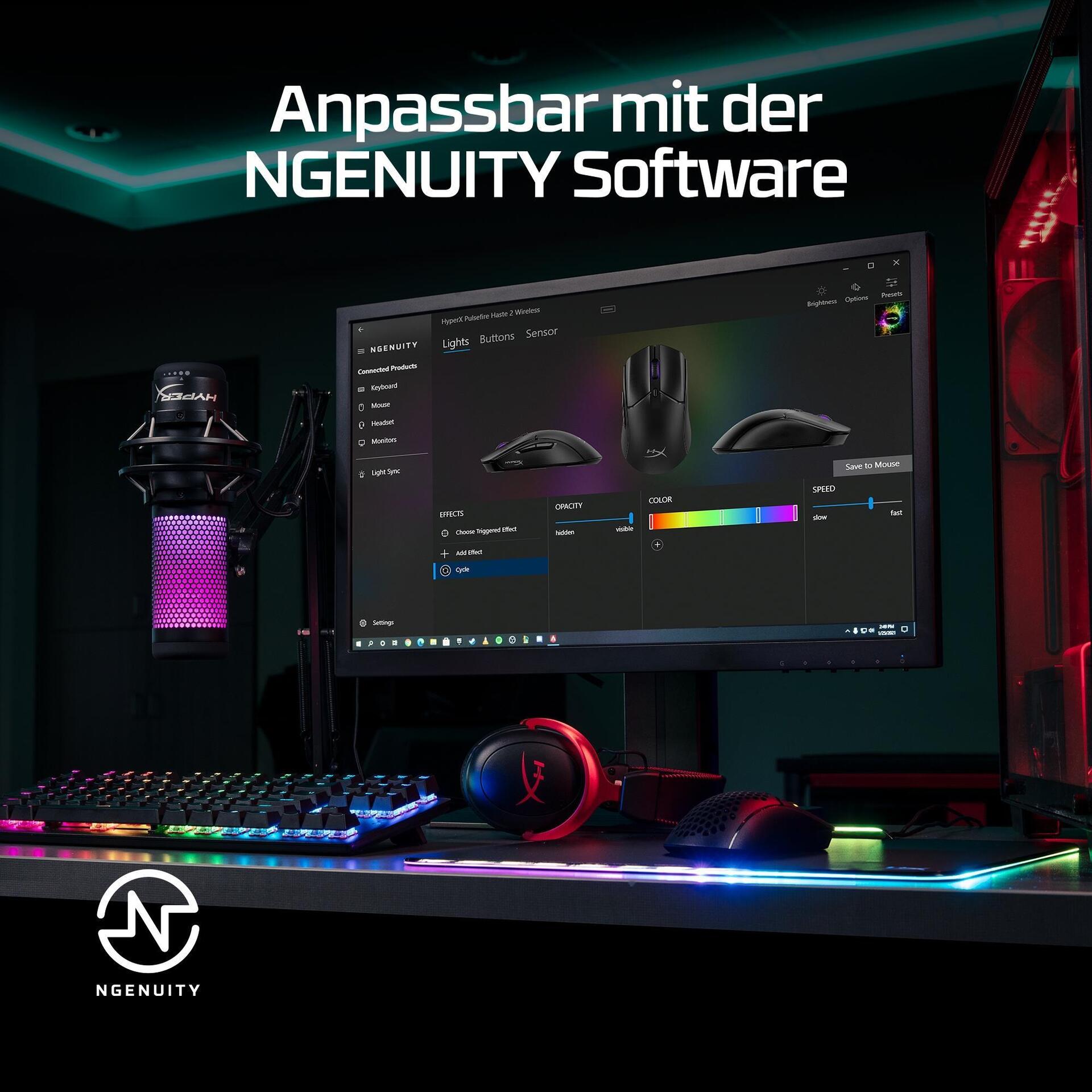 Die HyperX Pulsefire Haste 2 Wireless richtet sich an alle Gamer, die keine Millisekunde verlieren und von der Freiheit einer Wireless-Verbindung profitieren wollen. Dieses Nachfolgemodell verfügt über eine robuste Oberschale. Dabei behält es die 61 g Gewicht und die 100 Stunden Akkulaufzeit der ursprünglichen Pulsefire Haste, bietet aber auch einige Verbesserungen. Die Pulsefire Haste 2 Wireless bietet Dual Mode-Wireless-Konnektivität mit 2,4 GHz Wireless- und Bluetooth-Verbindungen. Über das Ladekabel kannst du sie dabei im kabelgebundenen Modus laden. Außerdem haben wir eine ganze Reihe von speziellen leistungsstarken HyperX Komponenten entwickelt, zum Beispiel den präzisen HyperX 26K- Sensor mit 26.000 dpi nativer Auflösung und einer Tracking-Geschwindigkeit von bis zu 650 IPS. Unsere speziellen HyperX Switches liefern einen überzeugenden Klick nach dem anderen mit haptischem und akustischem Feedback und sind auf eine Lebensdauer von bis zu 100 Millionen Klicks ausgelegt. Mit hochwertigen PTFE-Rollen mit geringer Reibung sowie dem mitgelieferten Grip-Tape profitierst du außerdem von einer erstklassigen Kontrolle deiner Maus. Optimiere mit der HyperX NGENUITY Software jede Mausbewegung, erstelle Makros für die 6 programmierbaren Tasten, passe deine DPI-Einstellungen an und individualisiere die RGB-Beleuchtung.