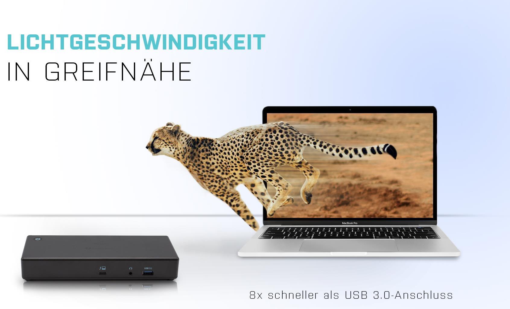 Hervorragende Bildqualität, schnelles Internet und die Möglichkeit, Daten mit einer Geschwindigkeit von über 1 GB pro Sekunde zu übertragen - auch wenn mehrere USB-Ports gleichzeitig verwendet werden. Natürlich können Sie auch ihren Kopfhörer oder Audio anschließen und Ihr Notebook aufladen (85W) - das alles mit einem einzigen Kabel.