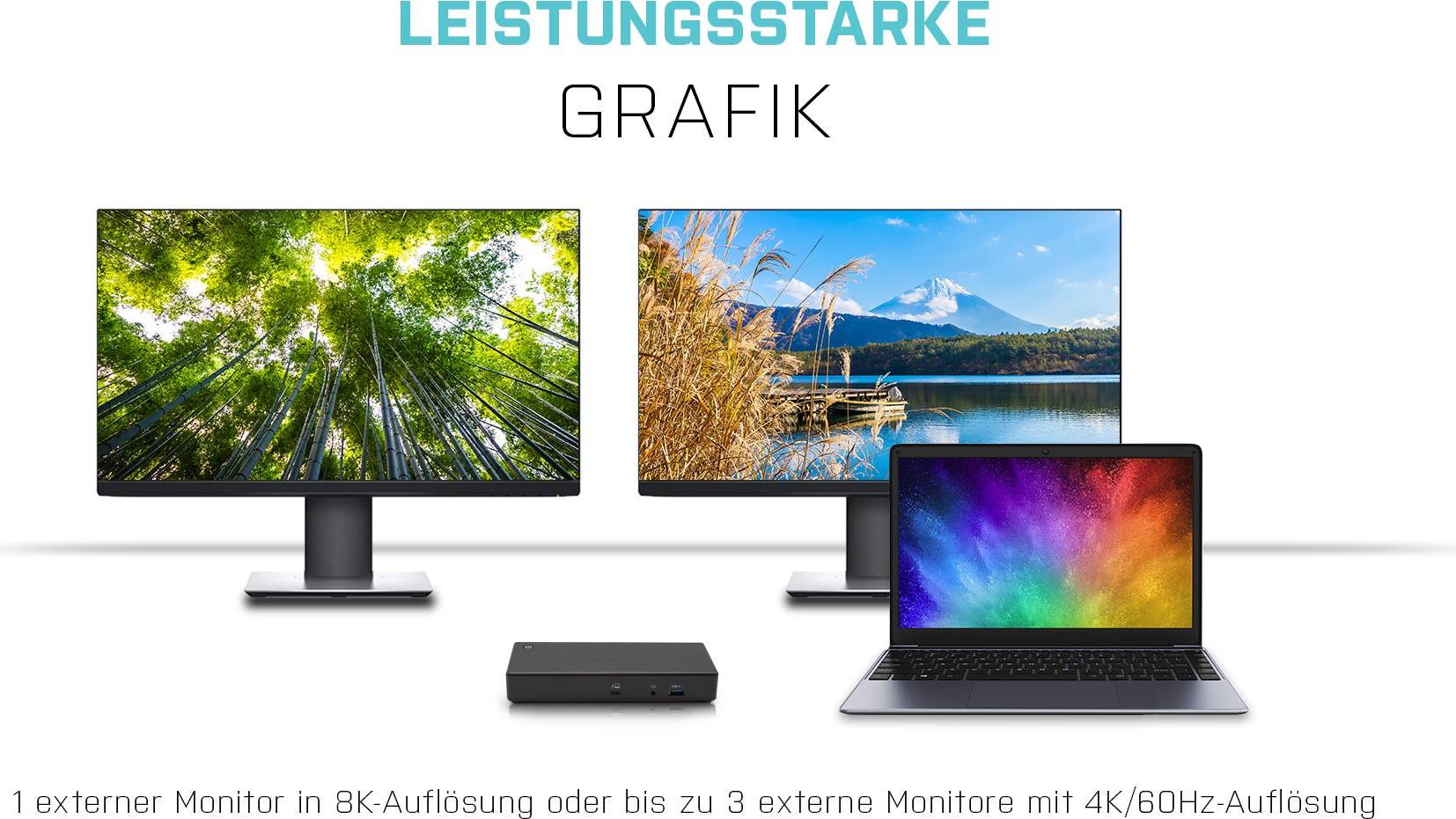 Dank dem integrierten DP 1.4-Protokoll können Sie diese Dockingstation an einen Monitor mit einer Auflösung von bis zu 8K (7680×4320) und einer Bildwiederholfrequenz von 30 Hz anschließen, die der Auflösung von vier Monitoren mit jeweils 4K entspricht. Es ist daher die ideale Lösung für Grafikdesigner, Analytiker, Entwickler, Filmeditoren oder Liebhaber von High-Definition-Video.