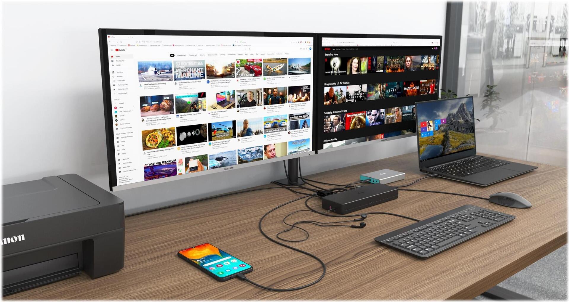 Eine universelle Dockingstation, die mit praktisch jedem Laptop verwendet werden kann, da sie den Anschluss an alle gängigen Ports unterstützt: USB 3.0, USB-C und Thunderbolt 3/4, bei gleichzeitiger Unterstützung aller gängigen aktuellen Betriebssysteme.