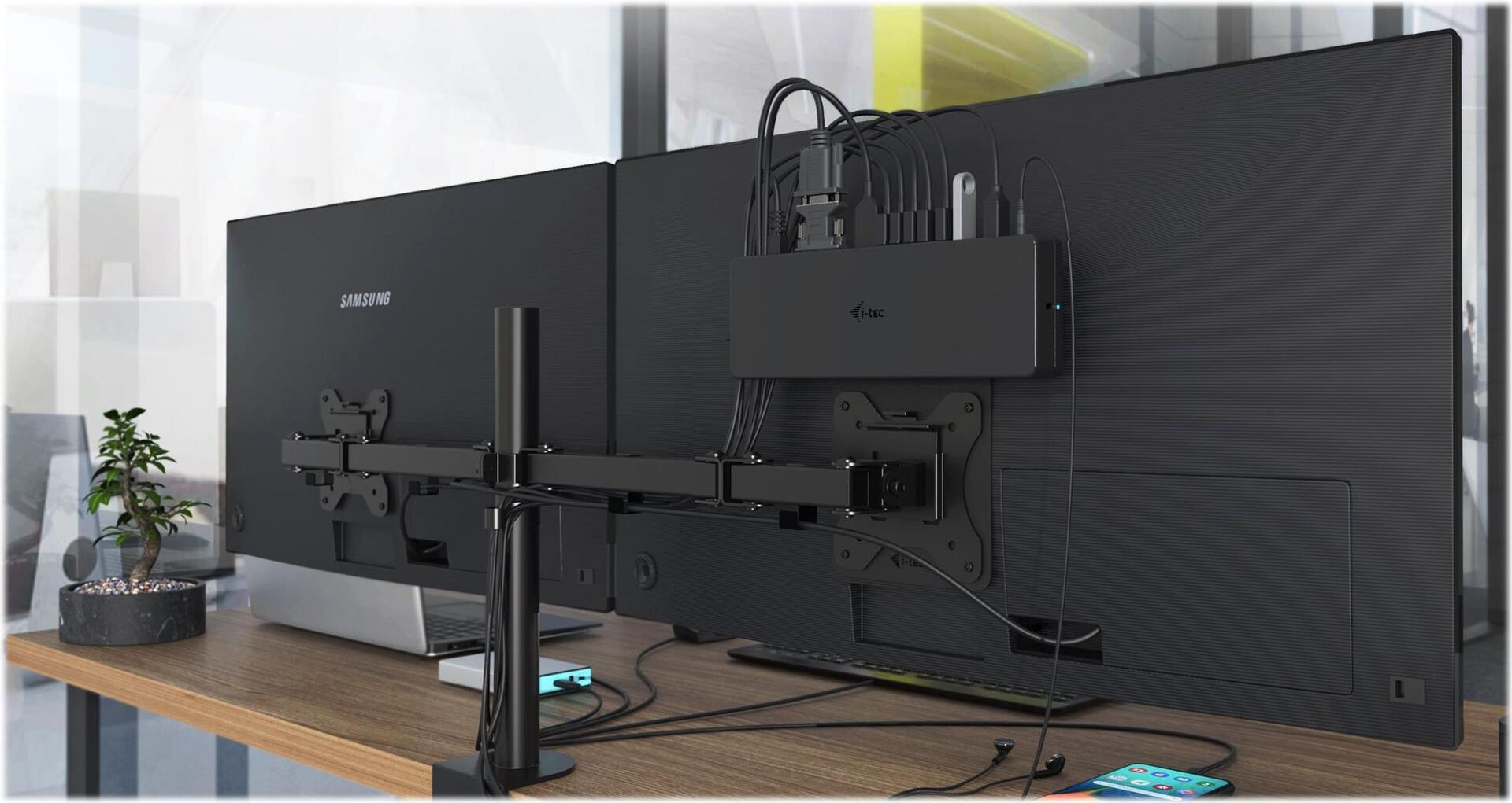 Die Dockingstation kann auch hinter dem Monitor mit VESA-Montageunterstützung installiert werden und bietet Ihnen sowohl maximale Arbeitseffizienz dank der Erweiterbarkeit der Anschlüsse als auch einen schön aufgeräumten Schreibtisch ohne Kabel.