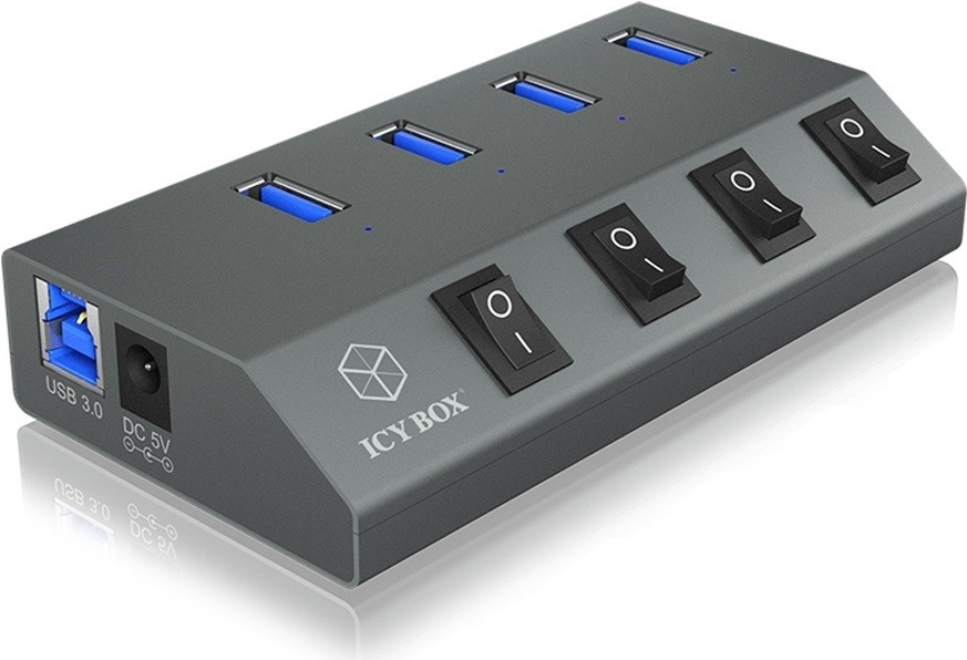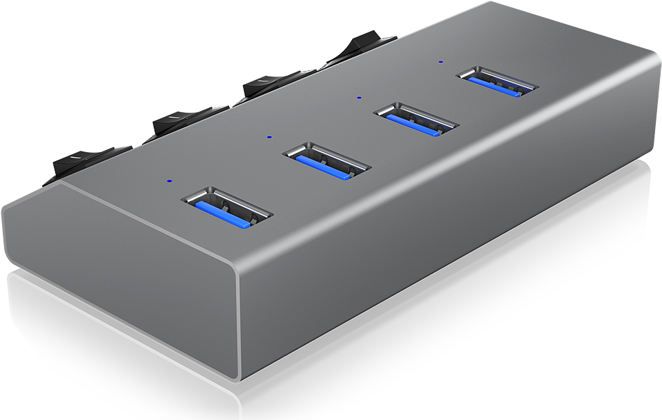 Der IB-HUB1405 kann dank USB 3.0 eine maximale Bandbreite von bis zu 5 Gbit/s erreichen. Alle Ports können im laufenden Betrieb einzeln per Schalter an- und ausgeschaltet werden, ohne die Funktion der anderen Ports zu unterbrechen. Mit dem 5 V Steckernetzteil lässt sich der Hub als aktives Ladegerät betreiben.