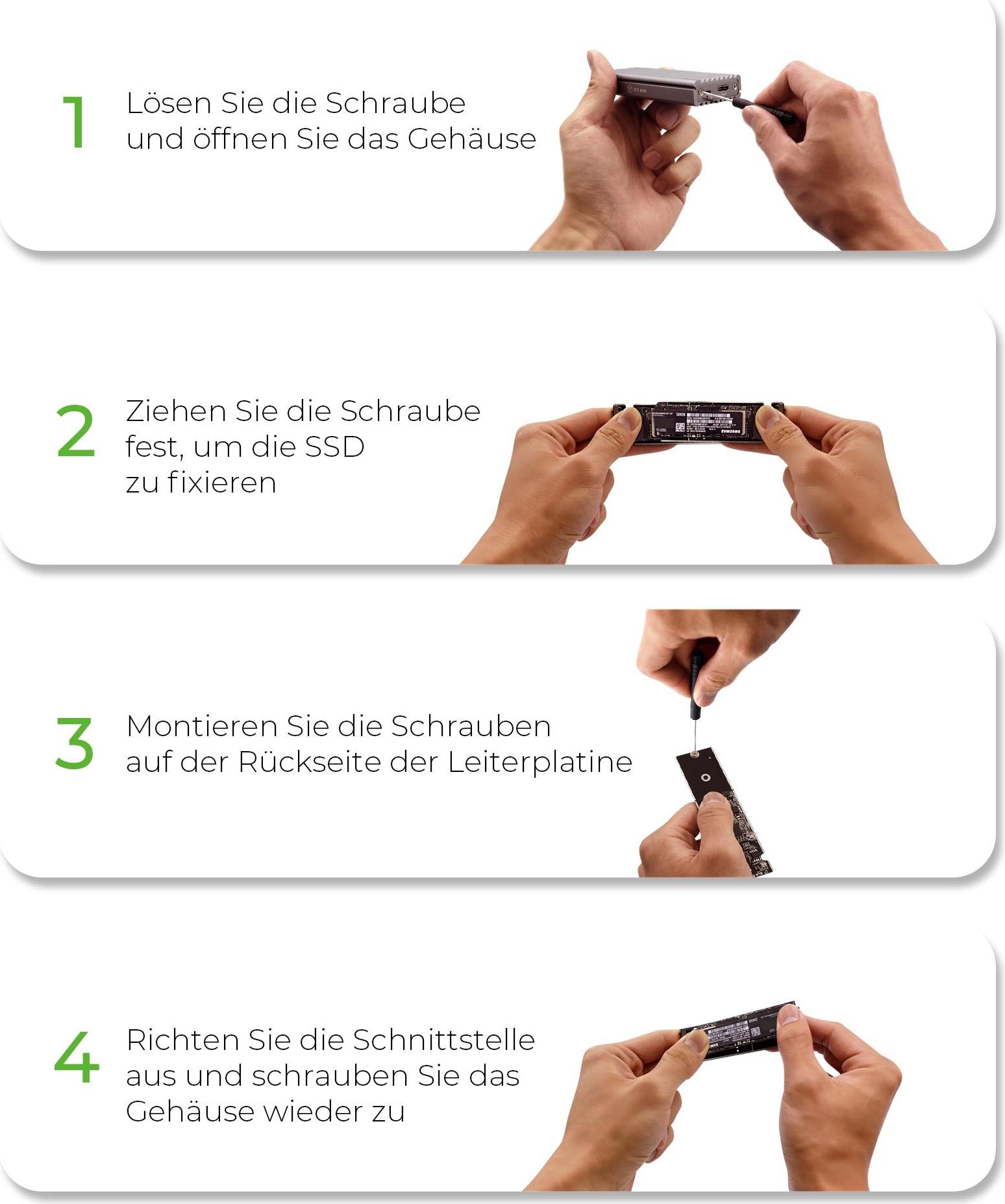 Bei dem Gerät gibt es eine gute Montageanleitung. Beim Öffnen der Packung muss man vorsichtig sein, da die Teile sehr klein sind. Im Betrieb wird es deutlich warm mit einer Samsung 970 Evo PCIe 3. Zudem liegt sowohl ein USB3- als auch ein USB-C-Anschlusskabel bei. Ein Betrieb sollte damit so gut wie überall möglich sein.