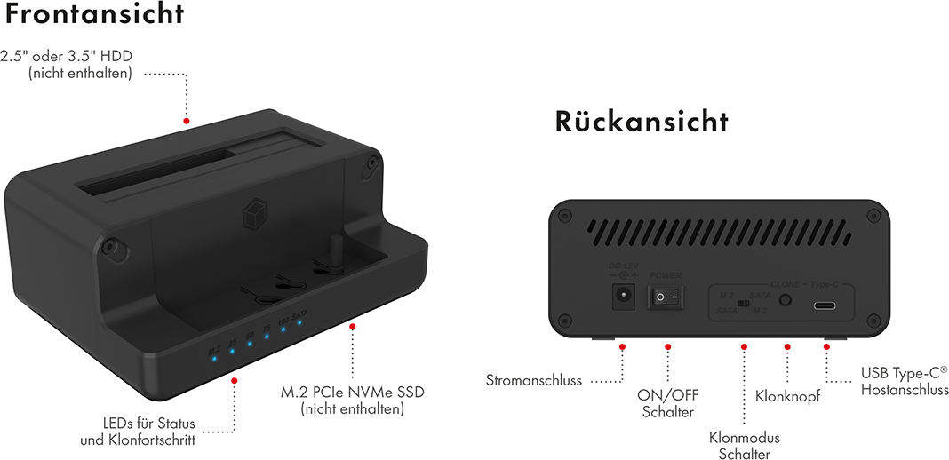 ICY BOX IB-2914MSCL-C31 - HDD - SSD - SATA - Serial ATA II - Serial ATA III - 2.5,3.5,M.2 - USB 3.2 Gen 2 (3.1 Gen 2) Type-C - 10 Gbit/s - Schwarz (IB-2914MSCL-C31) (B-Ware)