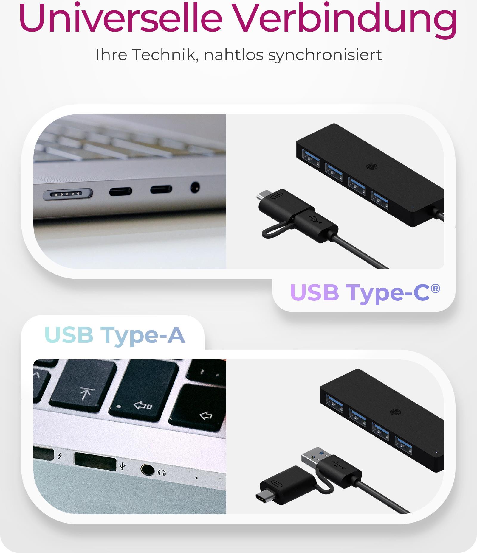 Dieser Hub ist dank einfacher Plug-and-Play-Einrichtung sofort einsatzbereit und erspart Ihnen komplizierte Installationen. Seine Typ-A- und Typ-C-Anschlüsse bieten Vielseitigkeit für verschiedene Geräte, erfüllen die Anforderungen moderner Nutzer und gewährleisten den Zugriff auf mehrere Peripheriegeräte ohne Leistungseinbußen.