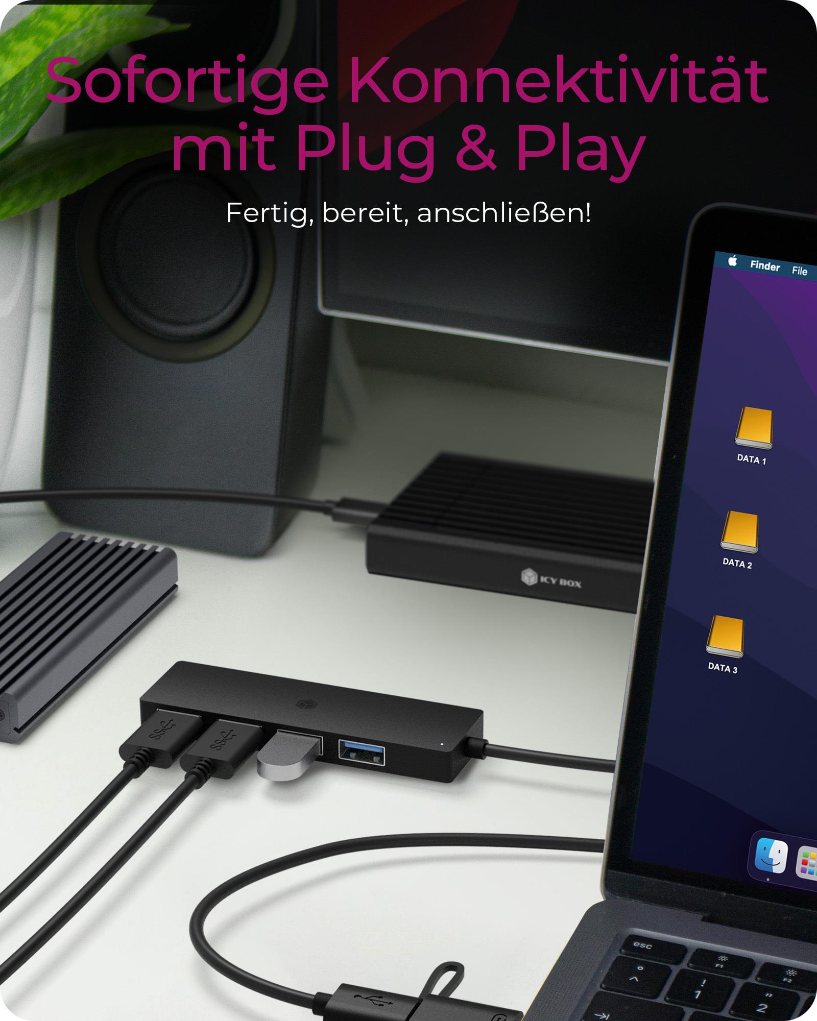 Der RaidSonic ICY BOX IB-HUB1424-C3 bietet eine Lösung zur Erweiterung der Anschlussmöglichkeiten. Mit vier USB 3.2 Gen 1-Anschlüssen ermöglicht dieser Hub Datenübertragungsraten von bis zu 5 Gbit/s und ist damit eine zuverlässige Wahl für alltägliche Aufgaben und anspruchsvolle Anwendungen. Mit seinem USB-betriebenen Design und dem robusten Kunststoffgehäuse verbindet er Langlebigkeit mit Komfort für den Desktop-Einsatz.