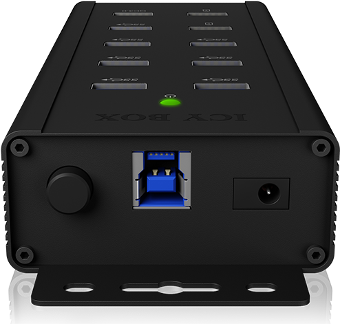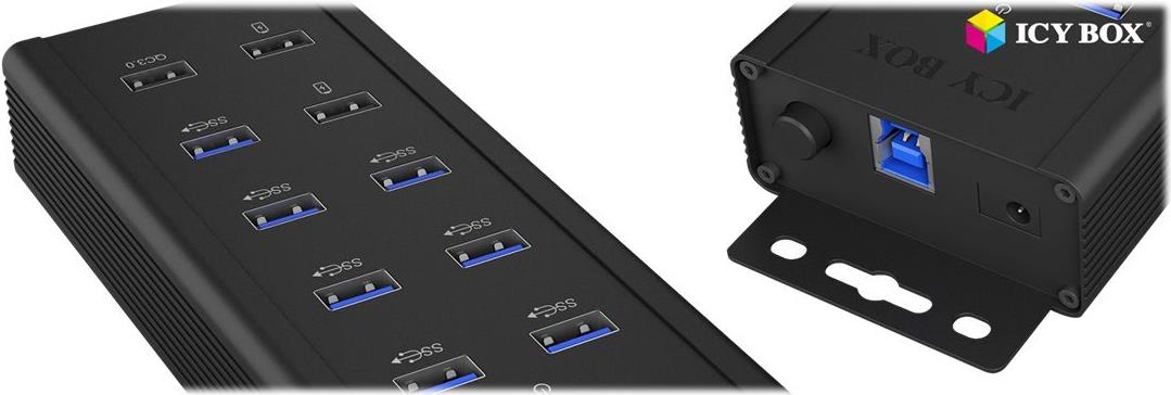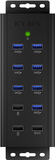 Der IB-HUB1703-QC3 ist speziell angepasst, um sich in Industrieumgebungen behaupten zu können. Das hochwertige Aluminium-Gehäuse hält so einiges aus und sorgt für eine effektive Wärmeabfuhr. Dank der Montagewinkel lässt er sich nahezu überall anbringen und nutzen. Neben dem hocheffizienten QC-3.0-Ladeanschluss sind zwei Schnell-Ladeanschlüsse (BC 1.2) sowie sieben weitere USB-3.0-Anschlüsse integriert.