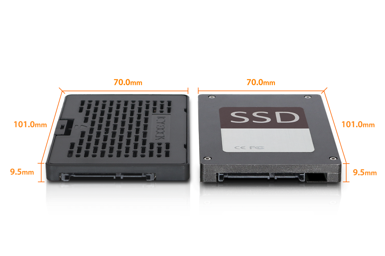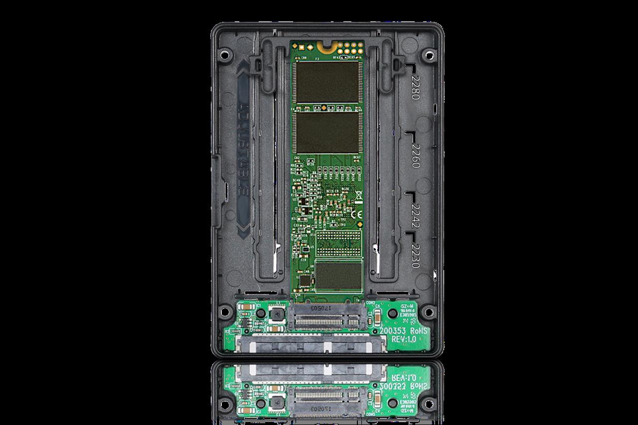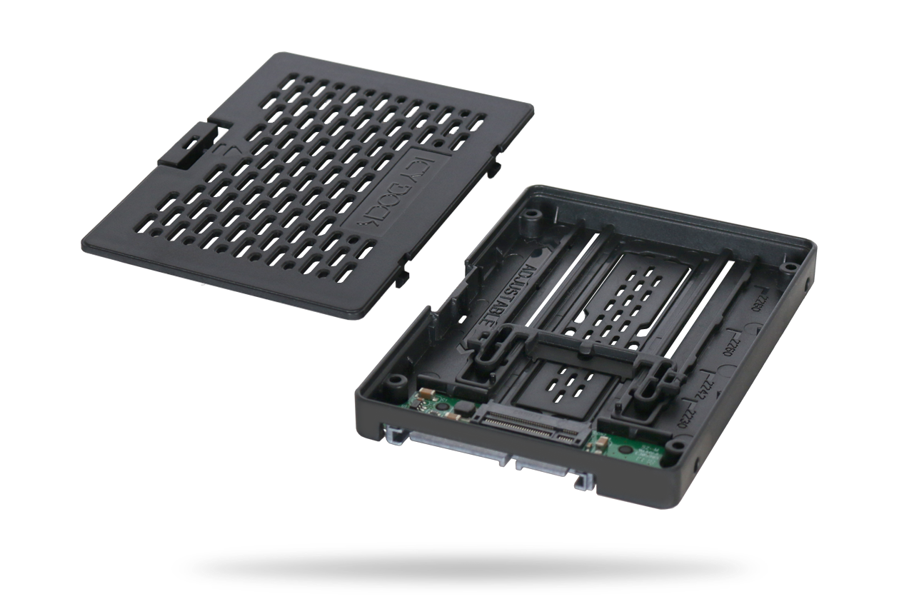 ICY DOCKs EZConvert MB703M2P-B ist die Komplettlösung, um jede M.2 SATA SSD in eine 2,5" SATA Festplatte oder SSD (9,5 mm Bauhöhe) mit exakt identischen Maßen und Anschlusspositionen umzuwandeln. Entwickelt mit einem Blick auf Kompatibilität nimmt dieser Adapter M.2 SSDs von 30 mm bis 80 mm Länge auf, ohne damit auf Schrauben oder Werkzeuge zurückgreifen zu müssen. So können diese SSDs überall dort installiert werden wo ein blankes 2,5" SATA Laufwerk aufgenommen werden kann wie zum Beispiel Hot Swap Slots, Wechselrahmen und Backplanes sowie Einbaurahmen für 2,5" Laufwerke aber auch alle ICY DOCK 2,5" Gehäuse und Module. MB703M2P-B schützt die empfindliche Platine ihrer M.2 SSDs zudem vor Stößen und Stürzen.