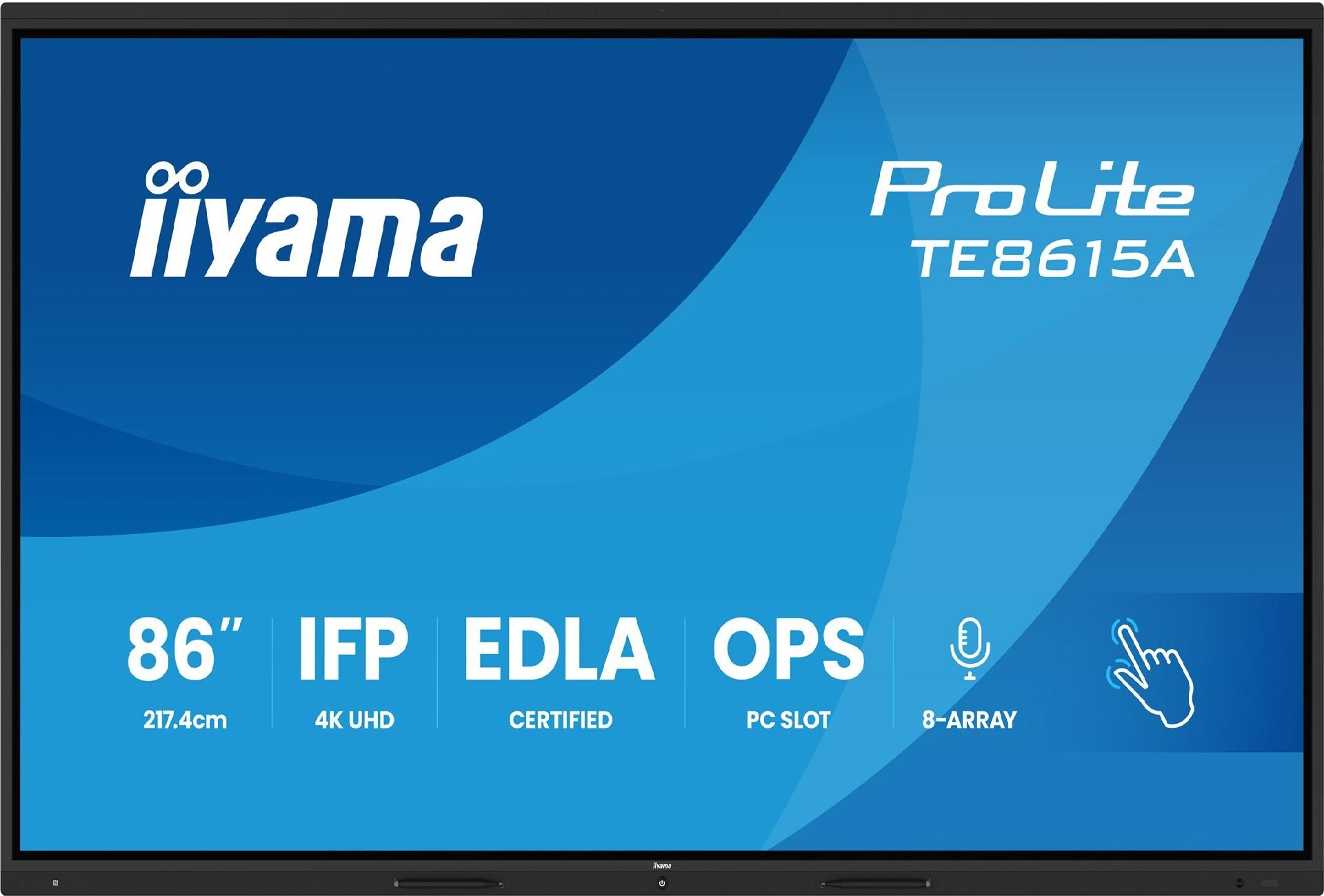 iiyama TE8615A-B1AG (TE8615A-B1AG) 86" Stylish IFP, iiWare21E (EDLA -Google-GMS-apps), Android 14, 16/128GB,40-Points DeepContrast IR+ with Optical Bonding, 3840x2160, UHD IPS panel,Metal Housing, Fan-less, NFC, PIR (Motion sensor), Speakers 2x 20W front facing+ 20W subwoofer, 8-Array Microphone, 2x HDMI, HDMI-out, DispayPort, 2xUSB-C up to 100W PD, Audio out: mini-jack and Optical Out, 550cd/m²,Landscape mode, Media Play USB Ports, AntiGlare Glass, LAN, WiFi6, BT5.0,RS232C, Integrated iiWare (WhiteBoard, iiShare (cast), browser, iiControl (DMS)),OPS PC Slot, VESA 600x400 (mount included) (TE8615A-B1AG)