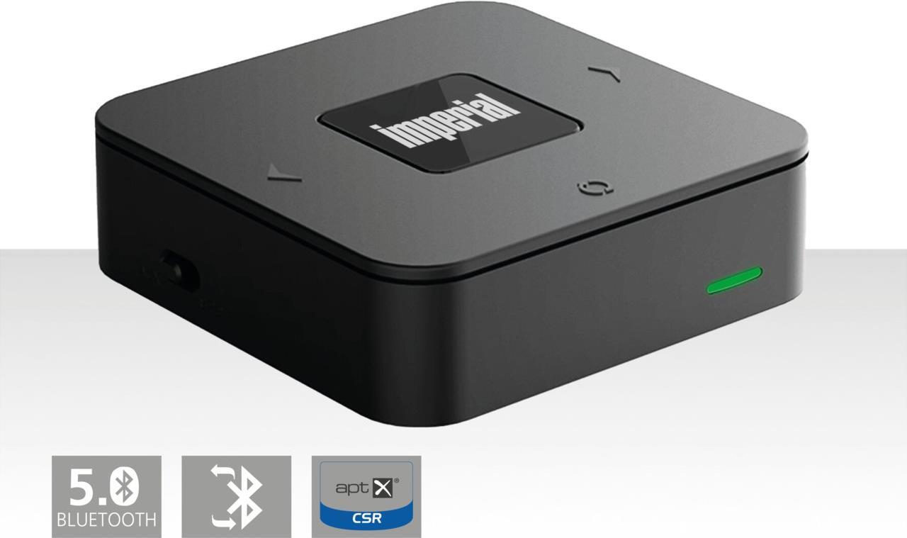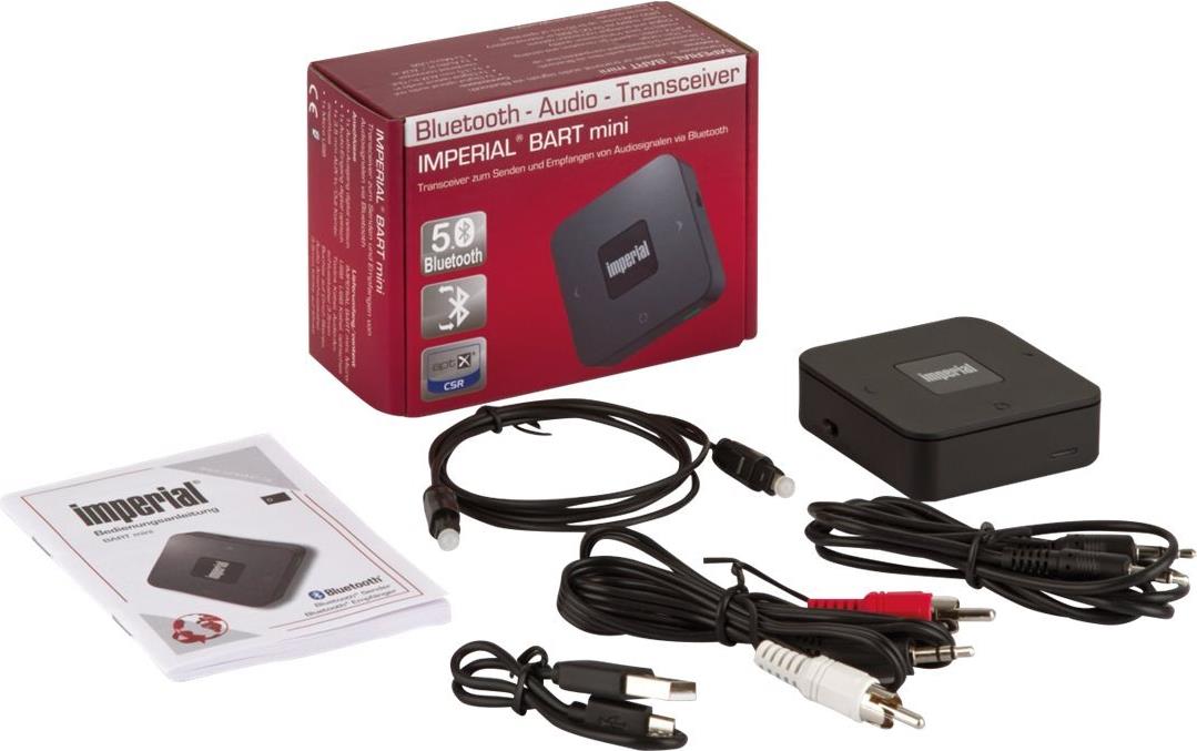 Der extrem kompakte IMPERIAL BART mini erlaubt sowohl das Senden als auch das Empfangen von Audiosignalen via Bluetooth. Der Transceiver arbeitet mit Bluetooth Version 5.0 (abwärtskompatibel) und verfügt über eine Übertragungsreichweite von bis zu 10 Metern. Dank aptX Support erfolgt die Übertragung sowohl im Sende- als auch im Empfangsmodus in bestmöglicher Qualität. Der BART mini verfügt über vielfältige Anschlussmöglichkeiten und kann sowohl über 5V DC (z.B. über USB) oder über den internen Li-Ion Akku (450 mAh, Betriebszeit: max. 20 Stunden) betrieben werden.Produkttext[/head]Extrem kompakter, akkubetriebener Transceiver zum Senden und Empfangen von Audiosignalen via Bluetooth.Der extrem kompakte IMPERIAL BART mini erlaubt sowohl das Senden als auch das Empfangen von Audiosignalen via Bluetooth. Der Transceiver arbeitet mit Bluetooth Version 5.0 (abwärtskompatibel) und verfügt über eine Übertragungsreichweite von bis zu 10 Metern. Dank aptX™ Support erfolgt die Übertragung sowohl im Sende- als auch im Empfangsmodus in bestmöglicher Qualität. Der BART mini verfügt über vielfältige Anschlussmöglichkeiten und kann sowohl über 5V DC (z.B. über USB) oder über den internen Li-Ion Akku (450 mAh, Betriebszeit: max. 20 Stunden) betrieben werden.[head]Hauptmerkmale