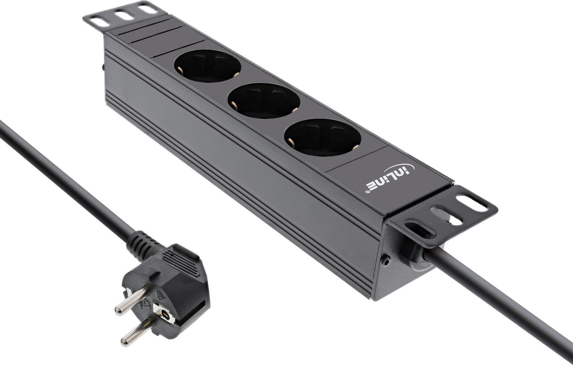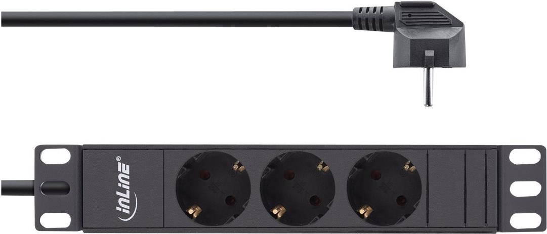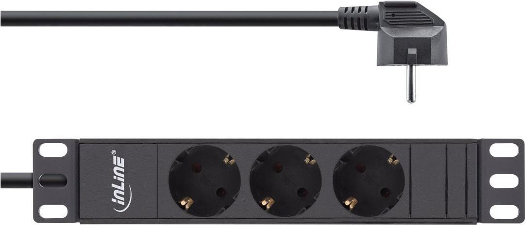 Steckdosenleiste mit 3 Steckdosen zum Einbau in den 10\" Netzwerkschrank• 3-fach Steckdosenleiste ohne Schalter• Steckdosen nach DIN 49440, um 45° gedreht• Maximale Gesamtbelastung 3680 W• Zuleitung: H05VV-F3G1,5mm², Länge 2m, mit gewinkeltem Schutzkontaktstecker CEE7/7• Abmessungen Leiste: Breite 10\" (254mm), Höhe: 1HE (45mm), Tiefe 45mm• Aluminium-Leiste• Farbe: schwarz RAL9004Produkttext[/head]Steckdosenleiste mit 3 Steckdosen zum Einbau in den 10\" Netzwerkschrank[head]Hauptmerkmale