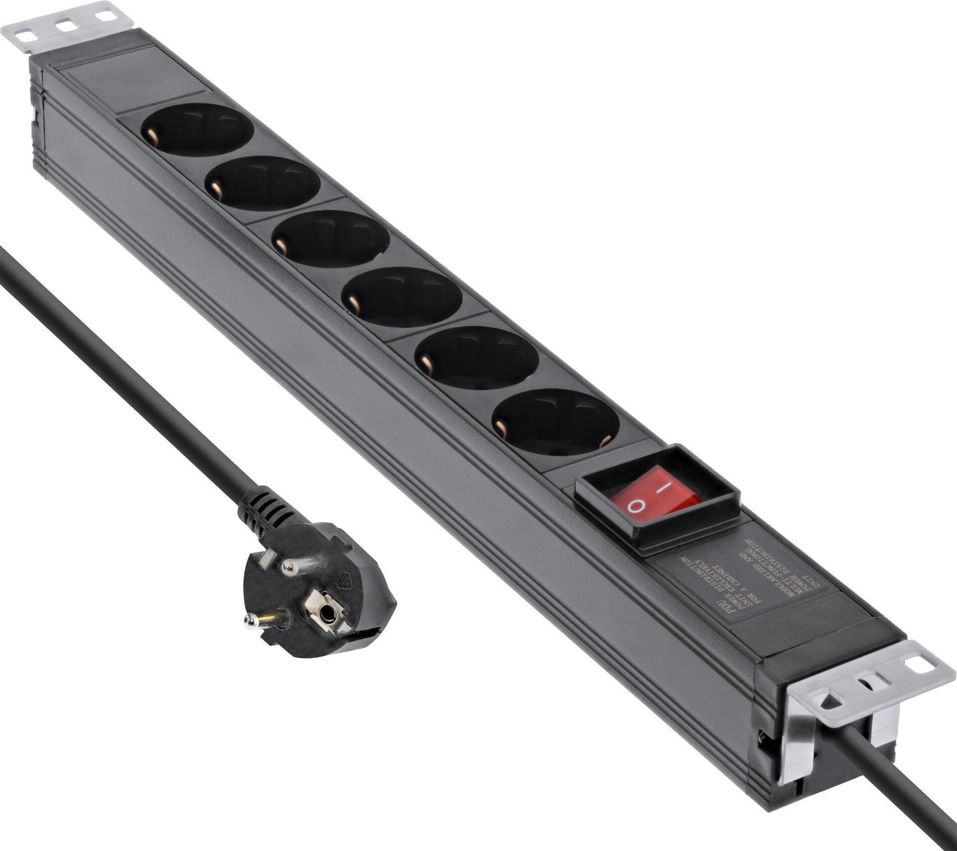 InLine® 48,30cm (19") Steckdosenleiste, 6-fach Schutzkontakt, mit Schalter, 2m, schwarz (16416S)
