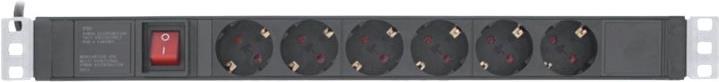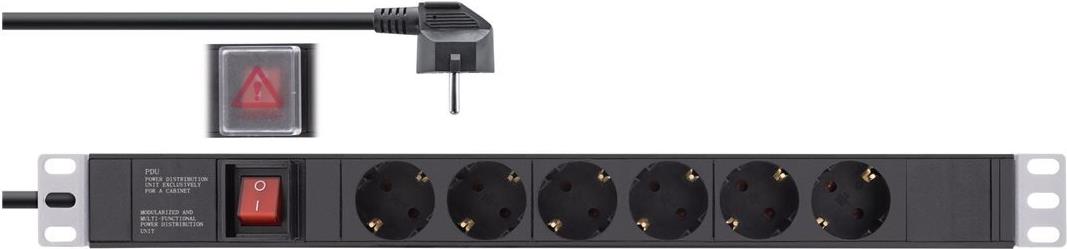 Steckdosenleiste mit 6 Steckdosen zum Einbau in den 19\" Netzwerkschrank• 6-fach Steckdosenleiste mit Schalter• Die 19\"-Winkel lassen sich in 8 Positionen an die Leiste aufstecken, dadurch ist eine individuellere Montage im Schrank möglich• Steckdosen nach DIN 49440, um 45° gedreht• Maximale Gesamtbelastung 3680 W• Zuleitung: H05VV-F3G1,5mm², Länge 2m, mit gewinkeltem Schutzkontaktstecker CEE7/7• Abmessungen Leiste: Breite 19\" (482,6mm), Höhe: 1HE (45mm), Tiefe 45mm• Aluminium-Leiste• Farbe: schwarz RAL9004