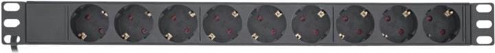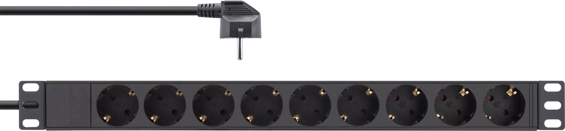 Steckdosenleiste mit 9 Steckdosen zum Einbau in den 19\" Netzwerkschrank• 9-fach Steckdosenleiste ohne Schalter• Steckdosen nach DIN 49440, um 45° gedreht• Maximale Gesamtbelastung 3680 W• Zuleitung: H05VV-F3G1,5mm², Länge 2m, mit gewinkeltem Schutzkontaktstecker CEE7/7• Abmessungen Leiste: Breite 19\" (482,6mm), Höhe: 1HE (45mm), Tiefe 45mm• Aluminium-Leiste• Farbe: schwarz RAL9004