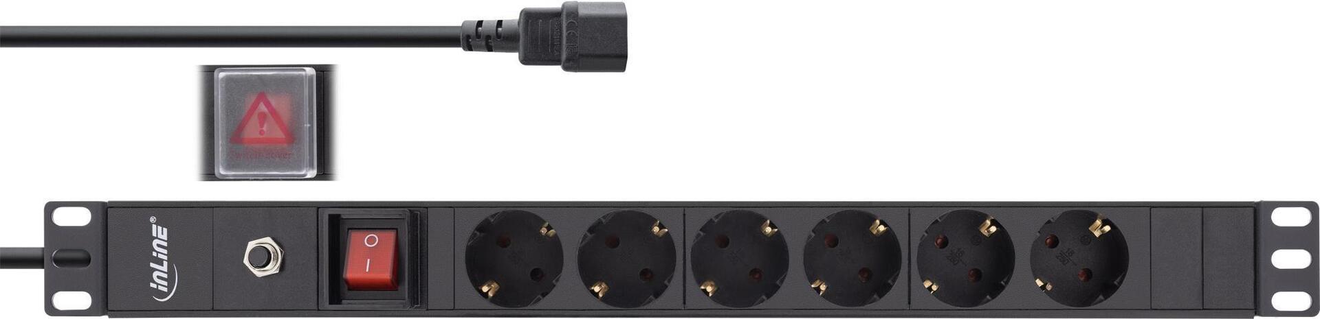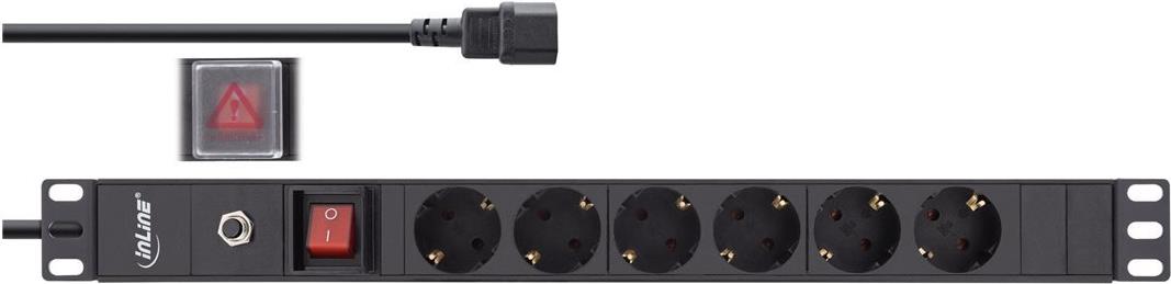 InLine® 48,30cm (19") Steckdosenleiste, 6-fach Schutzkontakt, C14 Anschluss, Überlastschutz, Schalter, 2m, schwarz (16426S)