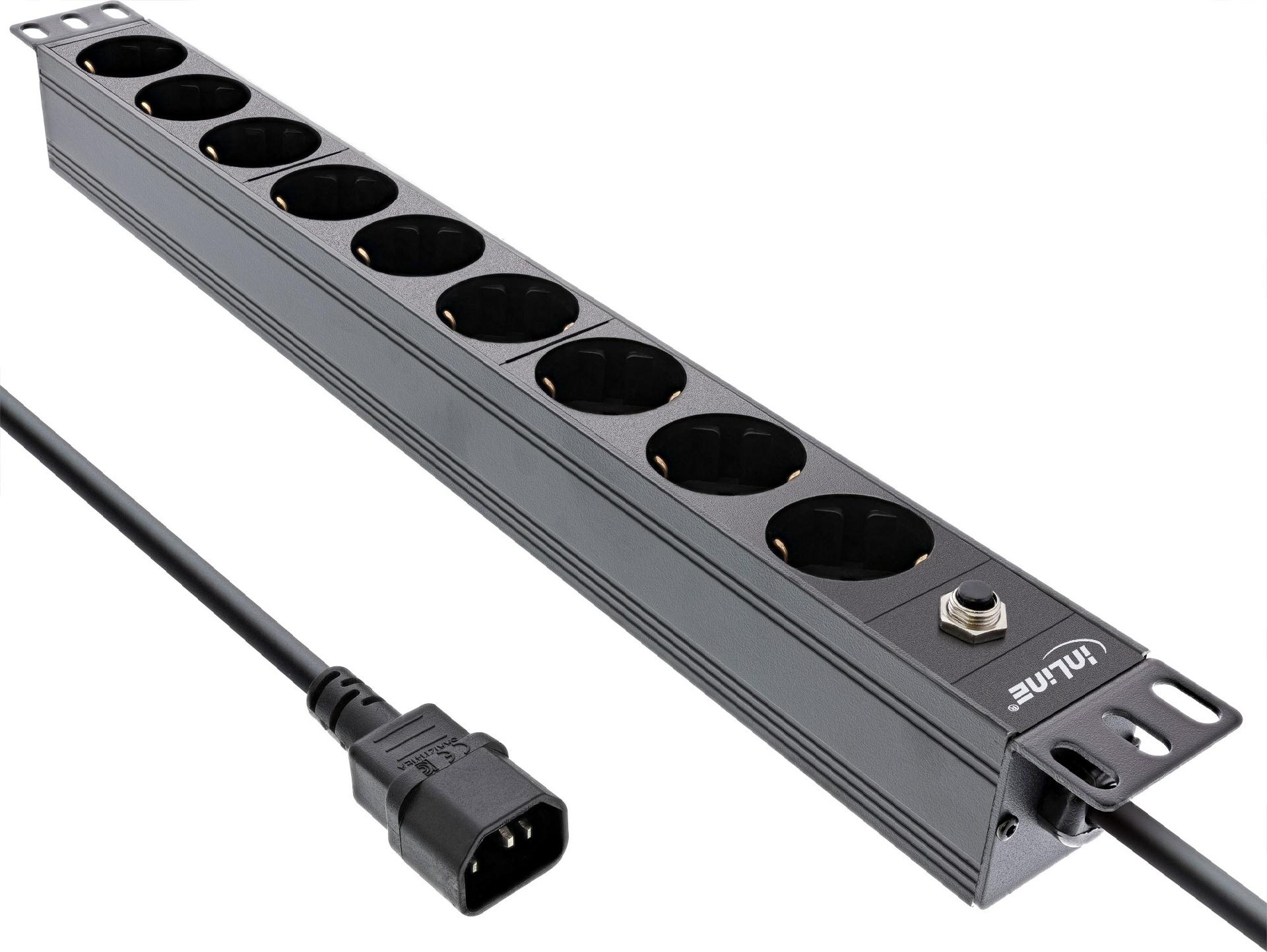 Steckdosenleiste mit 9 Steckdosen zum Einbau in den 19" Netzwerkschrank• 9-fach Steckdosenleiste ohne Schalter und mit Überlastschutz, max 2500 W