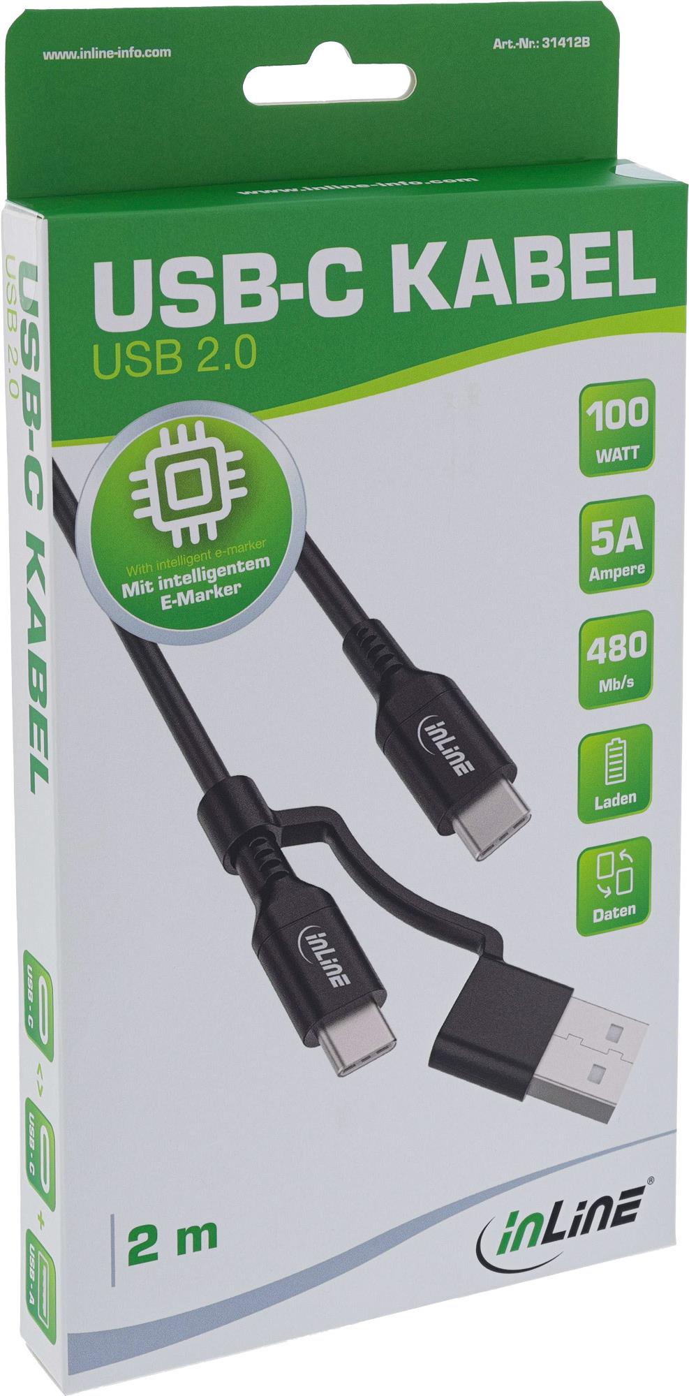 Das InLine® 2-in-1 USB-C Kabel bietet eine flexible Lösung für das schnelle Laden und die Datenübertragung moderner Mobilgeräte und Laptops. Mit einer maximalen Ladeleistung von bis zu 100 W und einem integrierten E-Marker Chip sorgt das Kabel für eine effiziente und sichere Energieversorgung. Der E-Marker erkennt automatisch die optimale Ladegeschwindigkeit für das angeschlossene Gerät und verhindert potenzielle Schäden durch Überspannung.Dank des mitgelieferten USB-A Adapters ist das Kabel nicht nur mit USB-C Netzteilen kompatibel, sondern ermöglicht auch das Aufladen an herkömmlichen USB-A Anschlüssen mit einer maximalen Leistung von 60 W (3 A). Das hochwertige TPE-Material sorgt für eine hohe Flexibilität und Langlebigkeit, während die USB 2.0-Technologie eine zuverlässige Datenübertragung von bis zu 480 Mb/s gewährleistet.Ideal für Systemhäuser, Wiederverkäufer und professionelle Anwender, die eine zuverlässige und vielseitige Lade- und Datenverbindung benötigen.Zusätzliche technische Daten:• USB-C Stecker auf USB-C Stecker mit Adapter auf USB-A
