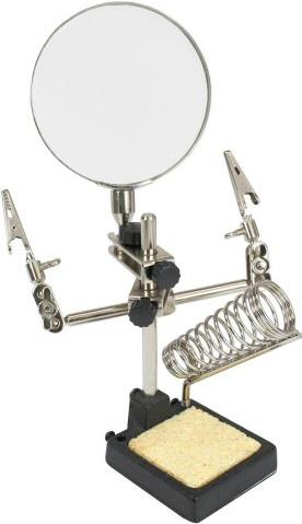 Der Klassiker, ein muss für jeden Elektroniker. Die dritte Hand besteht aus einer Lupe, 2 Krokodilklemmen, einem Schwamm und hat einen Lötkolben-Halter und ist somit der universelle Helfer für Lötarbeiten.Hauptmerkmale