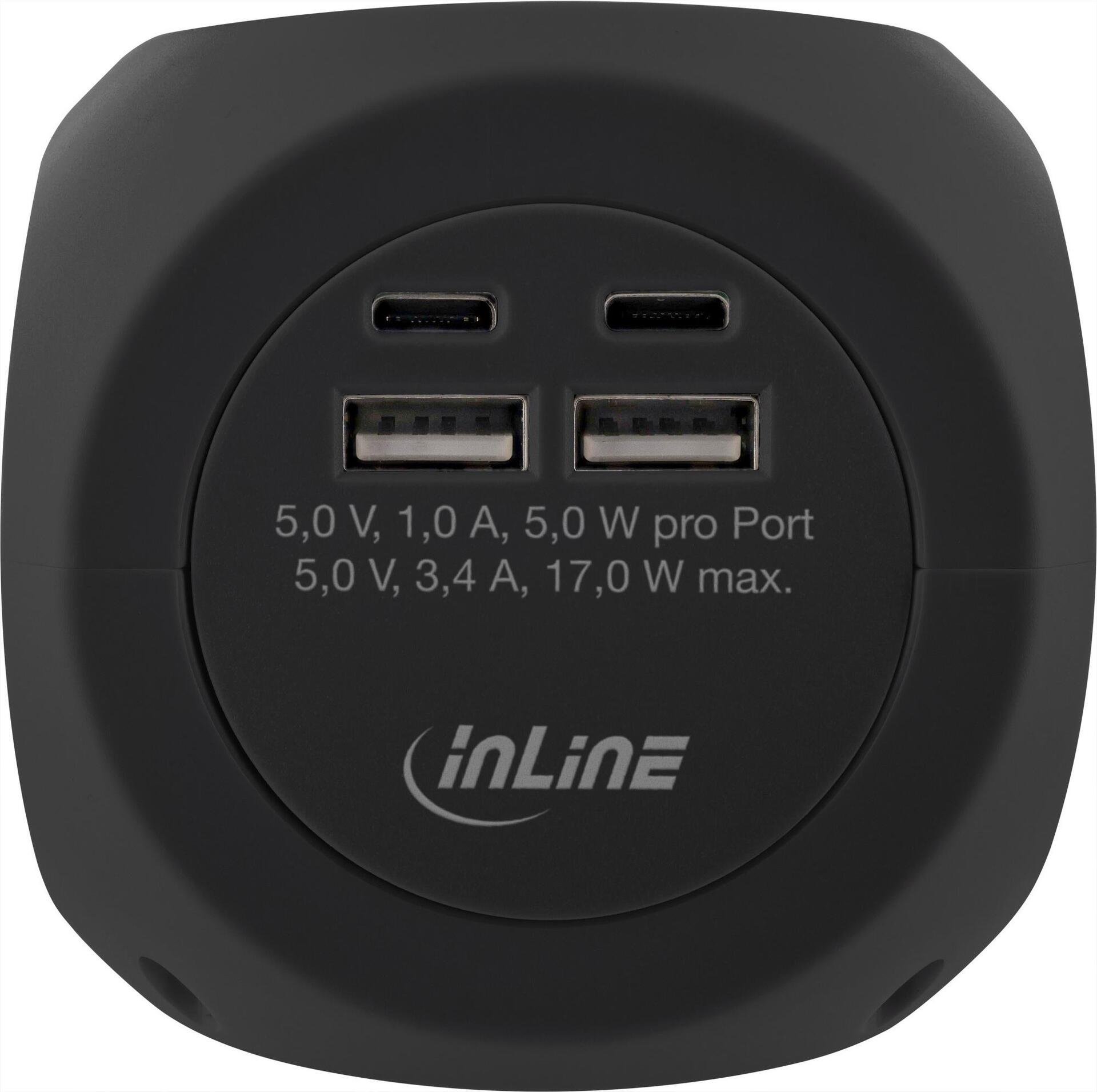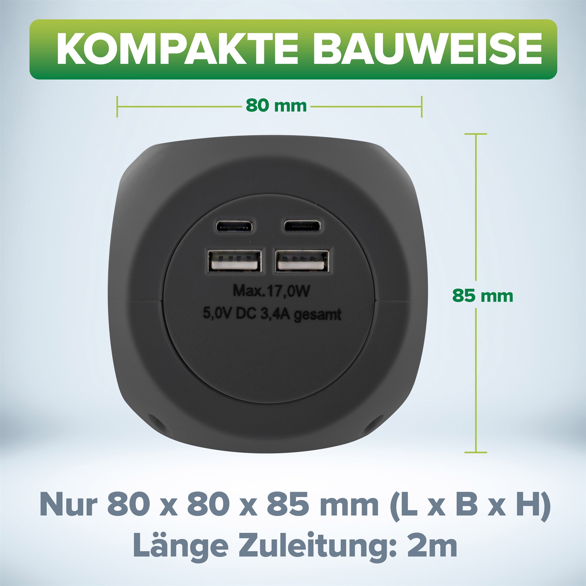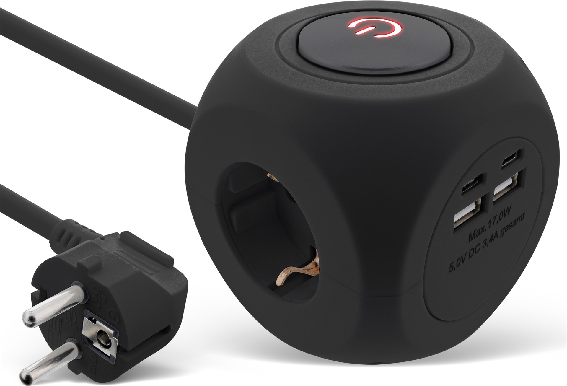 Entdecken Sie den 7-in-1 Charging Cube Steckdosenwürfel mit 3x Schutzkontakt-, 2x USB-C- und 2x USB-A-Anschlüssen für das gleichzeitige Laden von bis zu 7 Geräten. Der Charging Cube bietet eine maximale Leistung von 3680W (250V/16A) und eine USB-Gesamtleistung von 5V, 17W. Die kompakte Größe von 80 x 80 x 85mm spart Platz, sorgt für Ordnung und ist ideal für unterwegs geeignet. Der Charging Cube lässt sich mit dem eingebauten Schalter jederzeit ein- und ausschalten und besitzt eine rote LED-Betriebsanzeige. Die 3x Schutzkontakt-Anschlüsse sind zusätzlich mit einem Berührungsschutz ausgestattet.