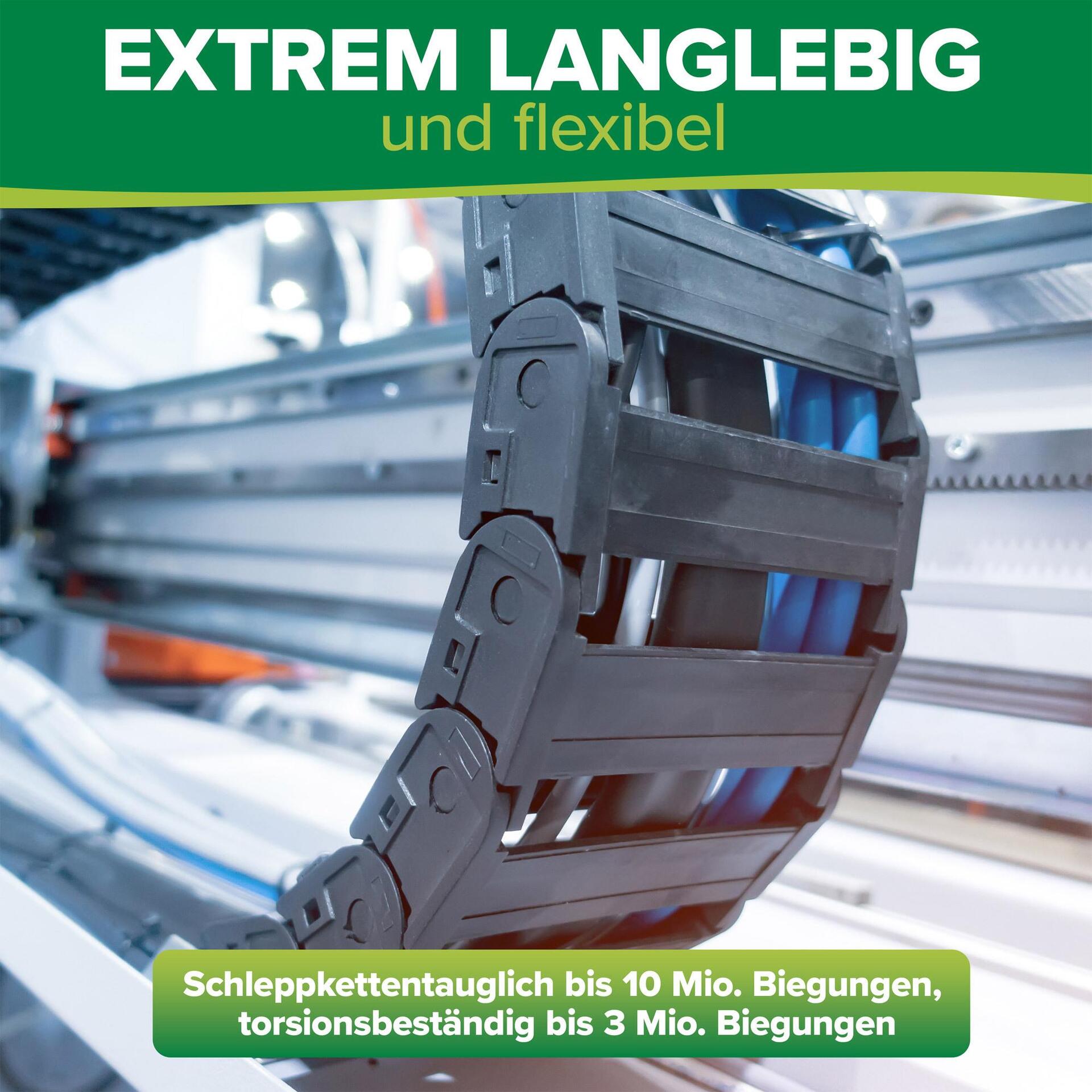 • Schleppkettentauglich bis 10 Millionen Biegungen und torsionsbeständig bis 3 Millionen Zyklen für den industriellen Einsatz