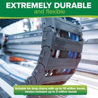 • Die robuste Bauweise macht das Kabel schleppkettentauglich bis zu 10 Millionen Biegungen und torsionsbeständig bis zu 3 Millionen Biegungen.