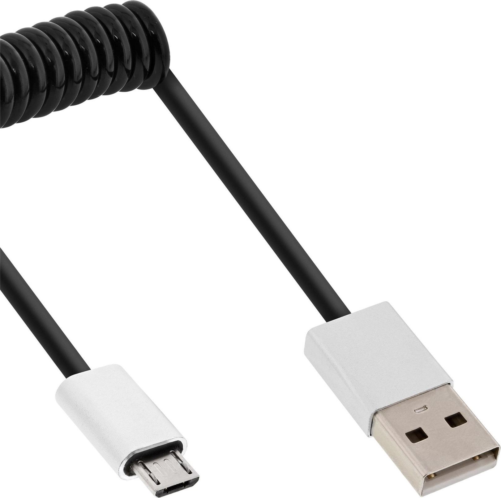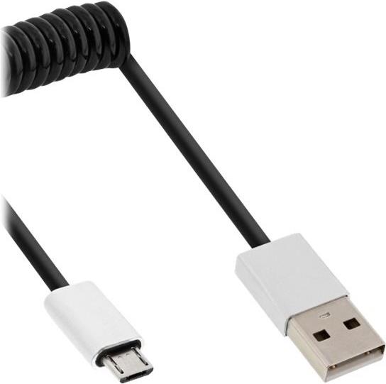 InLine® Micro-USB 2.0 Spiralkabel, USB-A Stecker an Micro-B Stecker, schwarz/Alu, flexibel, 3m (31730R)
