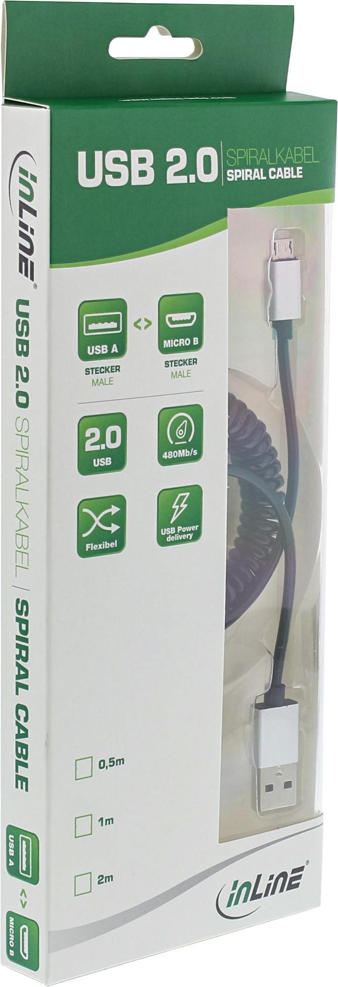 InLine® High Speed Micro USB 2.0 ( Universal Serial Bus ) Verlängerungskabel mit hochwertigen, aluminiumbeschichteten Steckern. Die spezielle Spiralform des Kabels eignet sich für alle Anwendungen, die eine kurzzeitige Verlängerung des Kabels sowie ein einfaches Einstecken und geringes Volumen bei Nichtgebrauch erfordern. Ideal für Smartphones, Tablets, externe USB-Festplatten, externe USB-Grafikkarten und andere Peripheriegeräte.• Entspricht den USB 2.0-Spezifikationen• USB Typ A Stecker auf Micro USB Typ B Stecker• Unterstützt Datenübertragungen von bis zu 480Mb/s• 15% dehnbares Spiralkabel für maximale Bewegungsfreiheit ohne Qualitätseinbußen• Aluminiumbeschichtete Stecker für maximale Robustheit und mechanische Zuverlässigkeit bei Steckvorgängen• Geeignet für den Anschluss von Smartphones, Tablets, externen USB-Festplatten, externen USB-Grafikkarten und anderen Peripheriegeräten mit Micro-USB-Typ-B-Schnittstelle an ein Gerät mit Micro-USB-Typ-B-BuchseProdukttext[/head]USB 2.0 Spiral-Anschlusskabel.USB A Stecker an Micro-B Stecker.Zum Anschluss z.B. von Mobilgeräten, USB Festplatten, USB Grafikkarten etc. mit USB Micro-B Anschluss an einen PC mit USB Typ A Buchse.Für Datenübertragungsrate bis 480Mb/s geeignet.Unterstützt USB Power delivery, bis 1m: 2,4 Ampere, bis 3m: 1.5 Ampere.[head]Hauptmerkmale