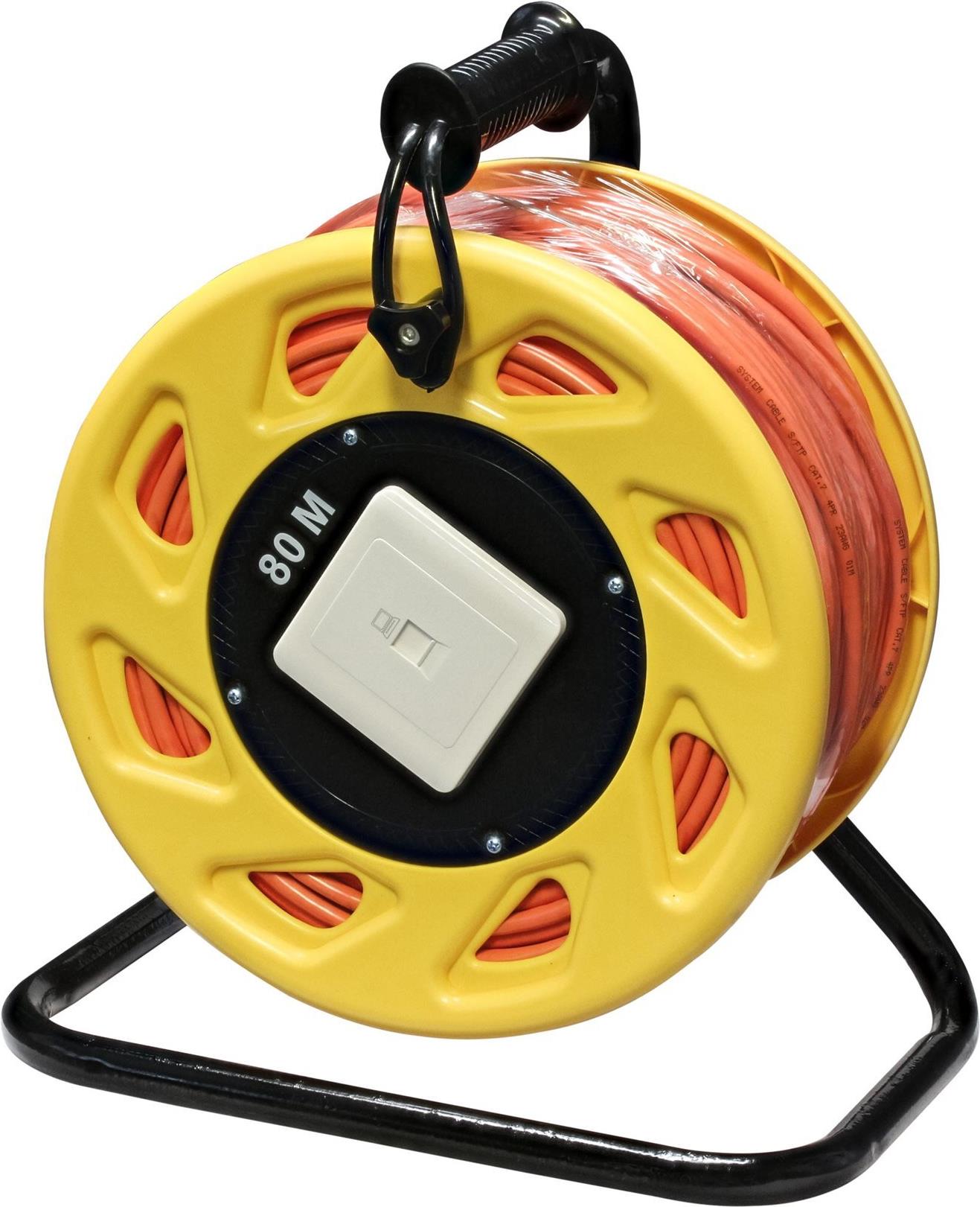 Kabeltrommel zur Verlängerung von Ethernetstrecken für temporäre Kabelanlagen bei Veranstaltungen, Vorführungen, Schulungen, Konferenzen, Übertragungswagen, Messen und bei Notfällen. Einfach Kabel abrollen und Patchkabel sowie Netzwerkgeräte miteinander verbinden.• Komplett mit Cat.7 S/FTP-PiMF 1000MHz Verlegekabel• 80m Verlängerung• integrierte Datendose Cat.6A 1xRJ45 Buchse mit Staubschutzkappe• Cat. 6A Keystone RJ45 Buchse am Kabelende• Kabelfarbe orange für bessere Signalwirkung• Abmessungen Trommel mit Haltegriff: 355x420x240mm• Einsatz-Temperaturbereich: -5°C bis +70°C