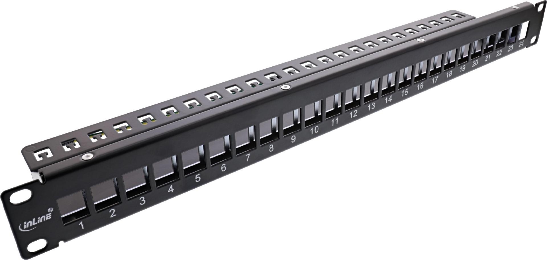 InLine® Patchfeld 24-fach, Keystone Snap-In Leerblech Patchpanel, 48,26cm (19"), 1HE, schwarz (76824H)