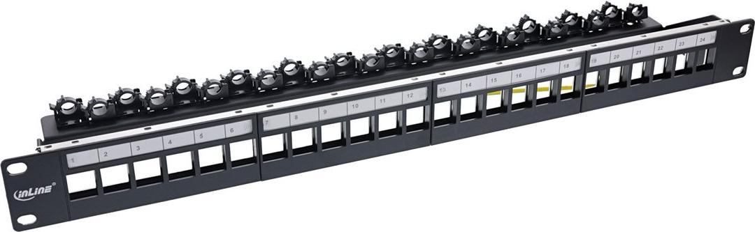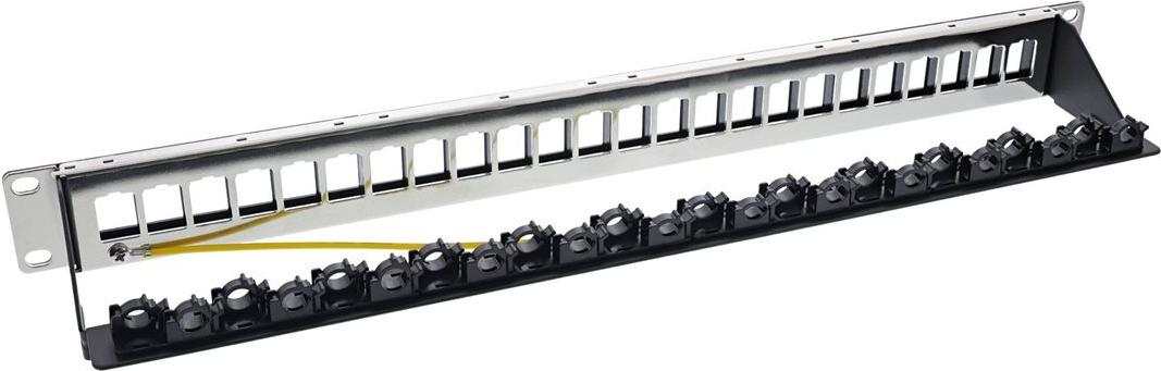 Patchfeld Leerblech zur Verwendung mit Keystone / Snap-In Modulen. Das Patchfeld hat bereits 24 vormontierte Kabelclips, welche die Installation der Patchkabel aud fer Rückseite vereinfachen und gleichzeitig als Zugentlasutung dienen. Zudem können die einzelnen Felder beschriftet werden.• geeignet für Cat.6A, Cat.6, Cat.5 Patch-Module und andere Keystone-Elemente