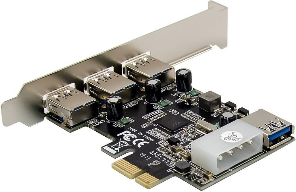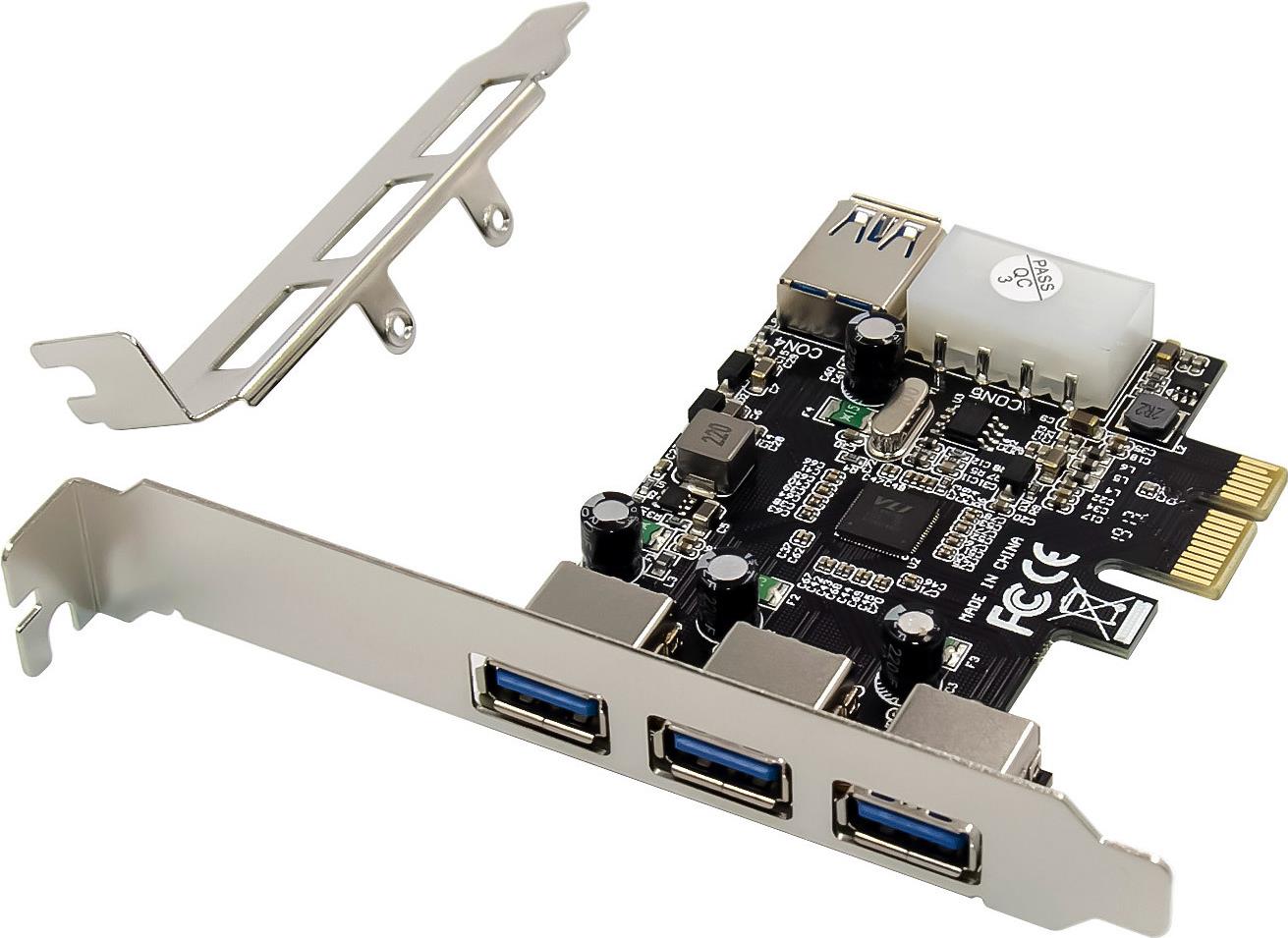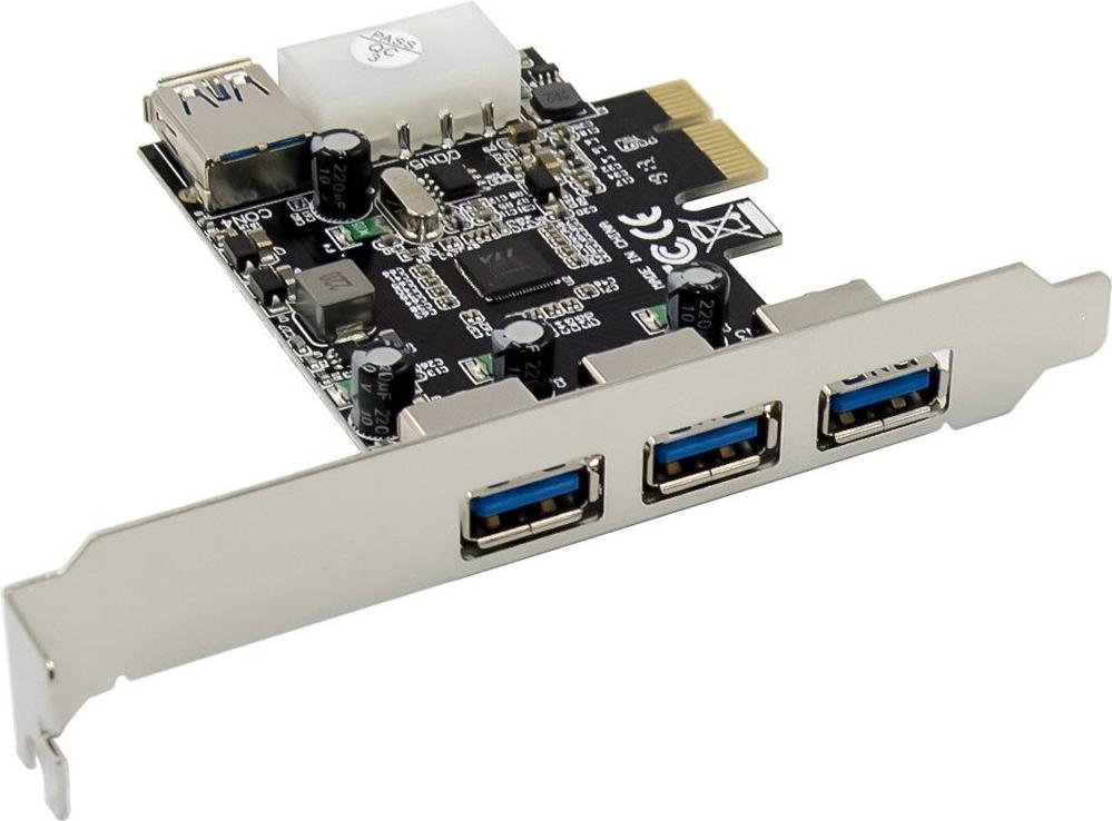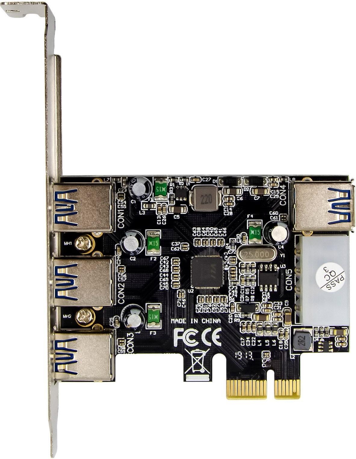 Diese InLine® PCI Express Karte ermöglicht die einfache Erweiterung eines PCs um drei externe und einen internen USB 3.2 Gen.1 Port. Dank des VIA VL805 Host Controllers bietet die Karte USB Super-Speed mit bis zu 5 Gb/s und ist vollständig abwärtskompatibel zu älteren USB-Standards.Für den stabilen Betrieb externer Geräte mit höherem Stromverbrauch verfügt die Karte über einen Molex kompatiblen 4-Pin Stromanschluss, der bei Bedarf eine zusätzliche Energieversorgung sicherstellt. Die Karte unterstützt Plug & Play sowie Hot Plug und ist sofort einsatzbereit.Die kompakte Bauform und das mitgelieferte Low-Profile Slotblech ermöglichen den Einbau sowohl in Standard-PCs als auch in kompakte Gehäuse.Technische Daten:• Bus Typ & PCIe: PCIe v2.0