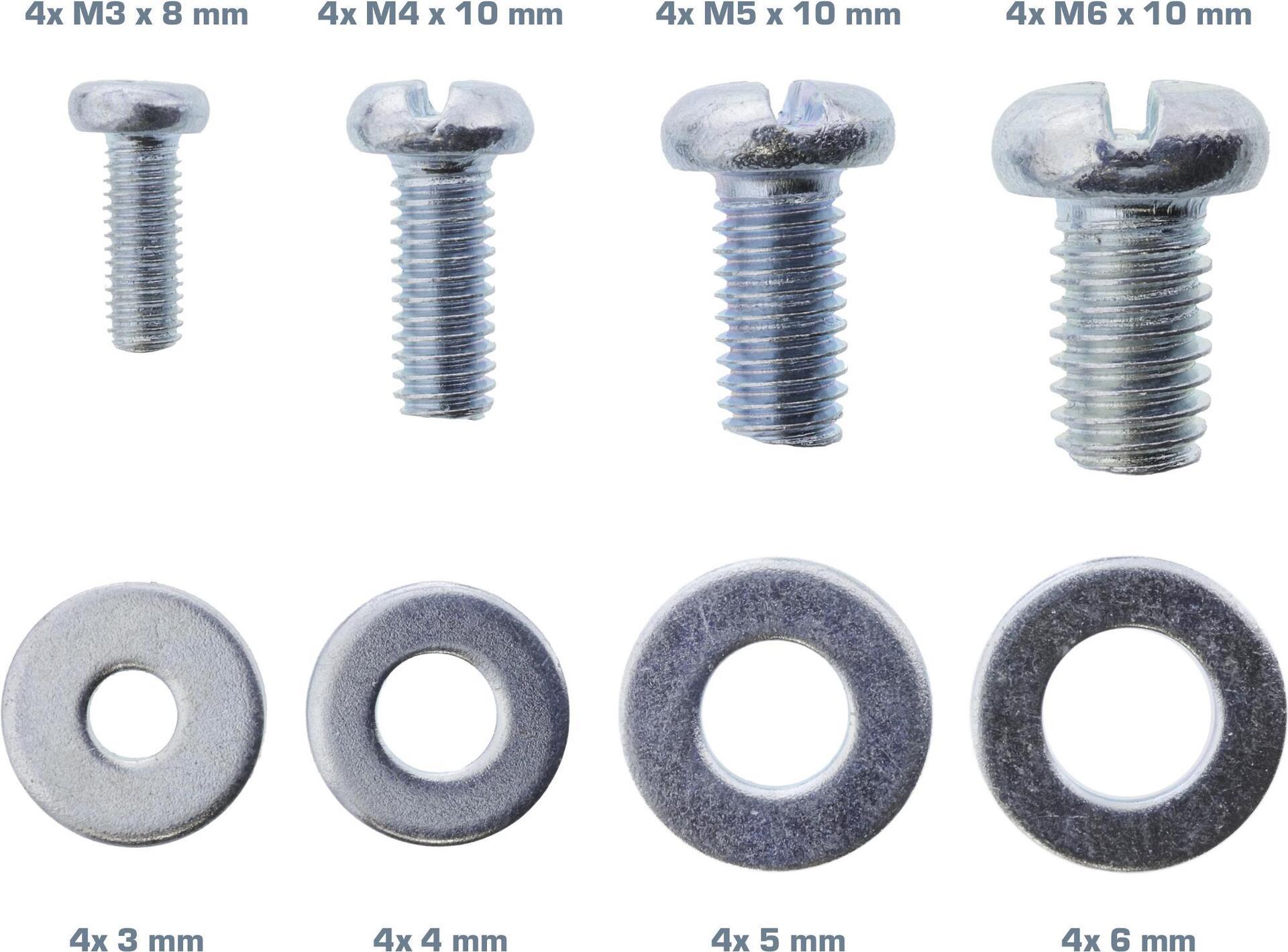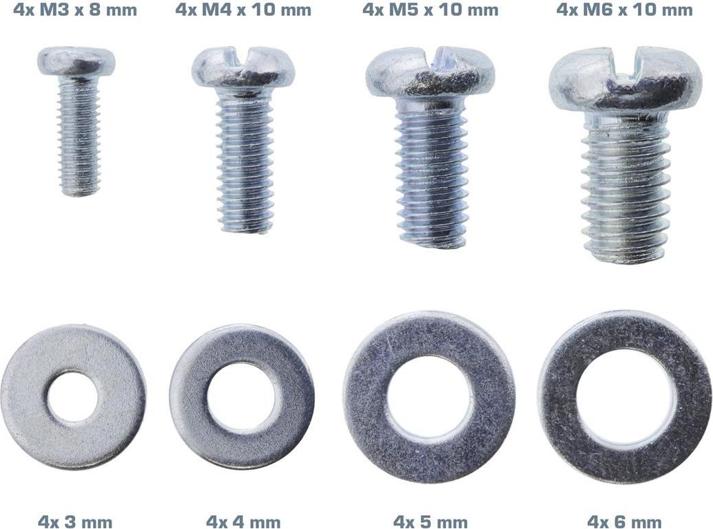 Das Schraubenset dient als Ersatzteil-Set für fehlende Schrauben und Unterlegscheiben z.B. zur Montage von Beamer an die Deckenhalterung. Packungsinhalt: • Schrauben: 4x M3x8mm, 4x M4x10mm, 4x M5x10mm, 4x M6x10mm• Unterlegscheiben: 4x 3mm, 4x 4mm, 4x 5mm, 4x6mm