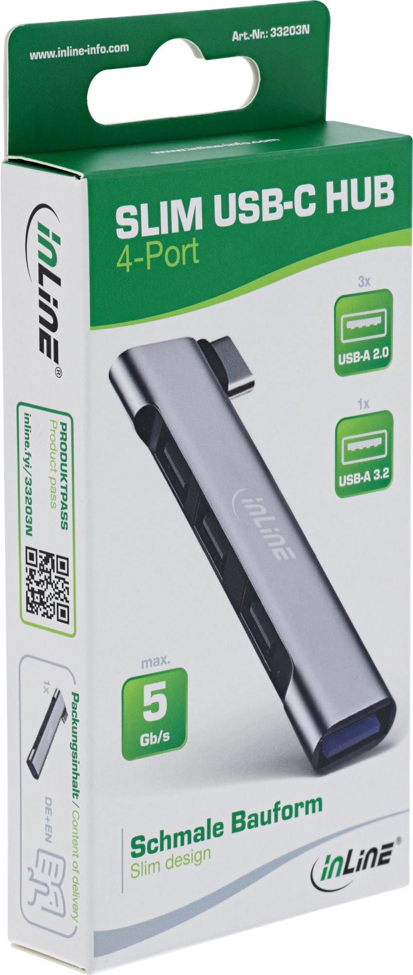 Dieser Slim USB-C Hub von InLine erweitert Ihren USB-C Anschluss um 4 USB-A Ports für Webcam, Maus, Tastatur und vieles mehr.• Anschlüsse: 3x USB 2.0 A Buchse, 1x USB 3.2 Gen.1 A Buchse