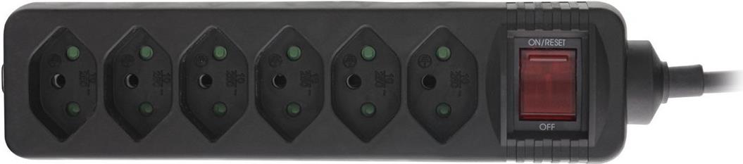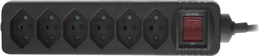 InLine® Steckdosenleiste SCHWEIZ • Steckertyp: T12• Buchsentyp: Typ13• Ausrichtung Anschlüsse: 90°• Anzahl Anschlüsse: 6• Kabel:H05VV-F3G1,5mm²• Eingangsspannung: 250V• max. Leistung: 2.300W• Kabellänge: 1,5m• Mit erhöhtem Berührungsschutz• Farbe: schwarz• Schalter: Ja• Material: Kunststoff