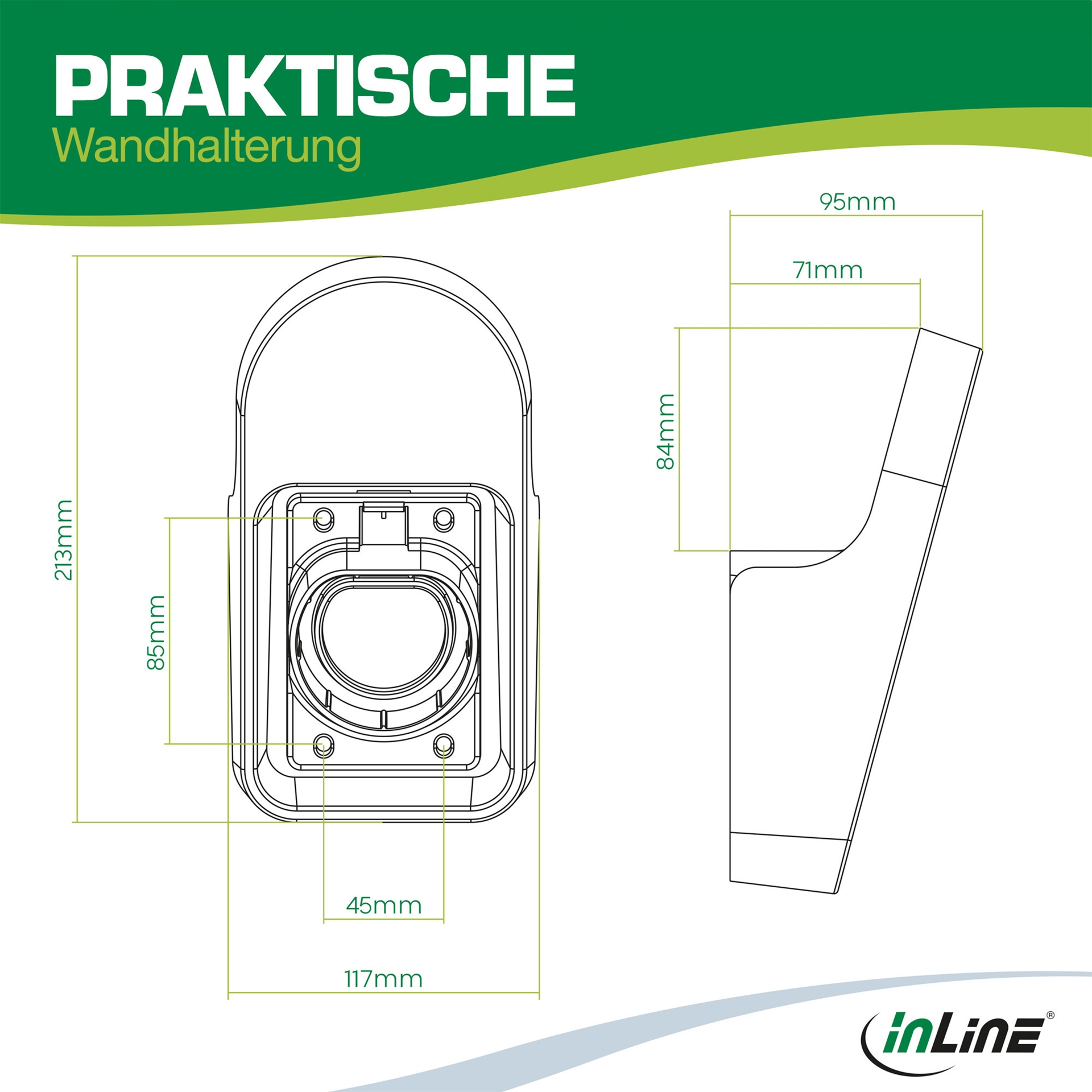 Diese Universal EV-Ladekabel Halterung von InLine ist die perfekte Lösung für die ordentliche und praktische Aufbewahrung Ihres Typ 2 E-Auto-Ladekabels (IEC 62196). Die Montage an der Haus- oder Garagenwand ist dank der beiliegenden Dübel und Schrauben schnell und unkompliziert erledigt. Durch die Halterung ist das EV-Ladekabel immer griffbereit an der Wand und schützt die Kabelkupplung vor Beschädigungen durch Überfahren.