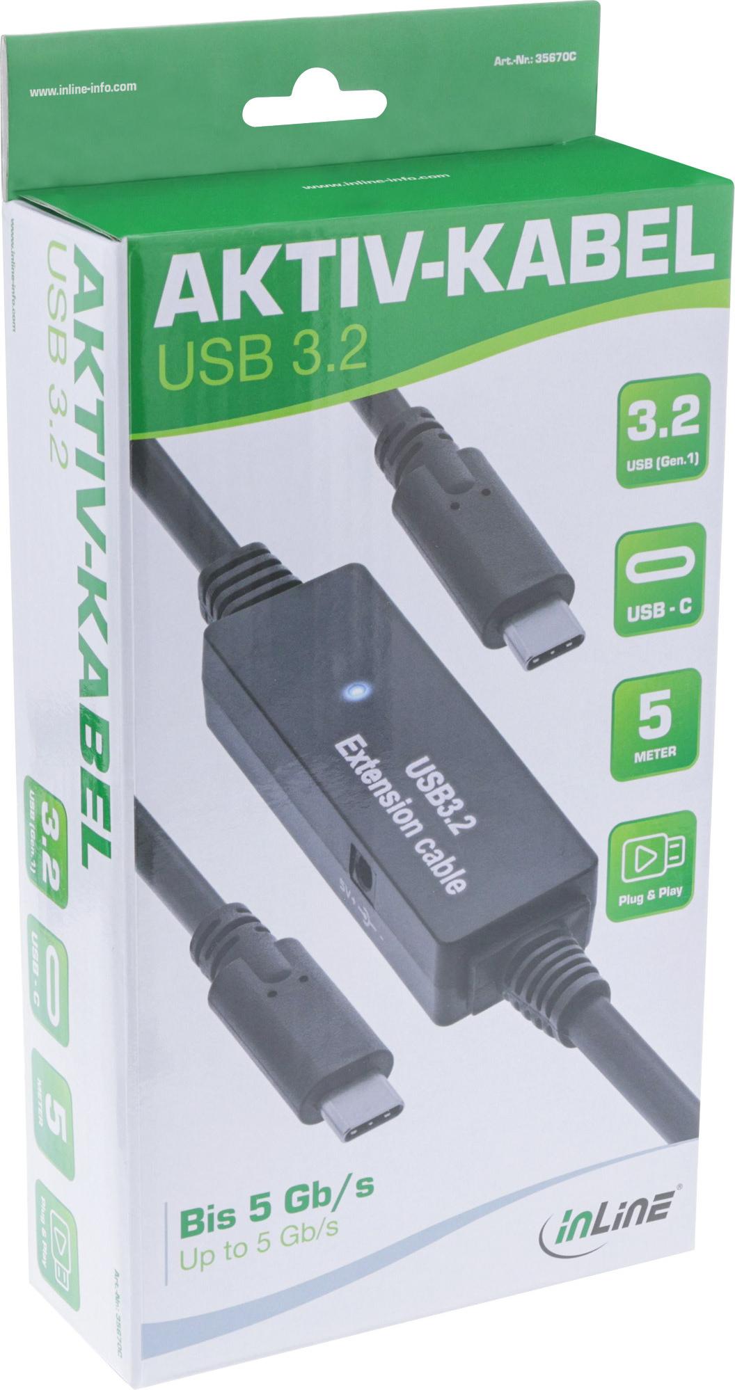 Das leistungsstarke USB 3.2 Gen.1 Aktiv-Kabel von InLine ist die ideale Lösung, um das Datensignale zu erweitern. Dabei können durch die integrierte Elektronik lange Distanzen von bis zu 15 Metern verlust- und störungsfrei überbrückt werden. Die USB-Verlängerung findet Anwendung bei Festplatten, Drucker, Webcams, Headsets, Mäusen, Tastaturen und anderen USB-Geräten. Die Datentransferrate von bis zu 5 Gb/s ermöglicht Ihnen eine blitzschnelle und zuverlässige Datenübertragung. Für Verlängerungen ab 10 Metern und länger empfehlen wir die Verwendung des mitgelieferten Steckernetzteils.USB 3.2 Gen.1 kompatibelAktives USB 3.2 Gen.1 Kabel mit integrierter Elektronik für optimale SignalübertragungDatentransferrate bis zu 5 Gb/sHot-swap Plug and Play kompatibel, im laufenden Betrieb zu verwendenUSB-C Stecker auf USB-C SteckerGehäuse: KunststoffFarbe: schwarzUnterstützt Betriebssysteme ab Windows 7 und MacOS 10 und neuerHinweis:Dieser Artikel ist nicht kaskadierbar, d. h. nicht durch weitere aktive Verlängerungen erweiterbarMit Netzteil (nur bei 10m und 15m): AC 100-240V, 50/60Hz, DC 5.0V/1.0A (max. 5.0W)Daten externes Steckernetzteil:Eingangsspannung: 100-240V ACEingangswechselstromfrequenz: 50/60 Hz, 0,3 AAusgangsspannung: 5,0 V DCAusgangsstrom: max. 1,0 AAusgangsleistung: 5,0 WDurchschnittliche Effizienz im Betrieb: 75,59 %Leistungsaufnahme bei Nulllast: 0,075 W