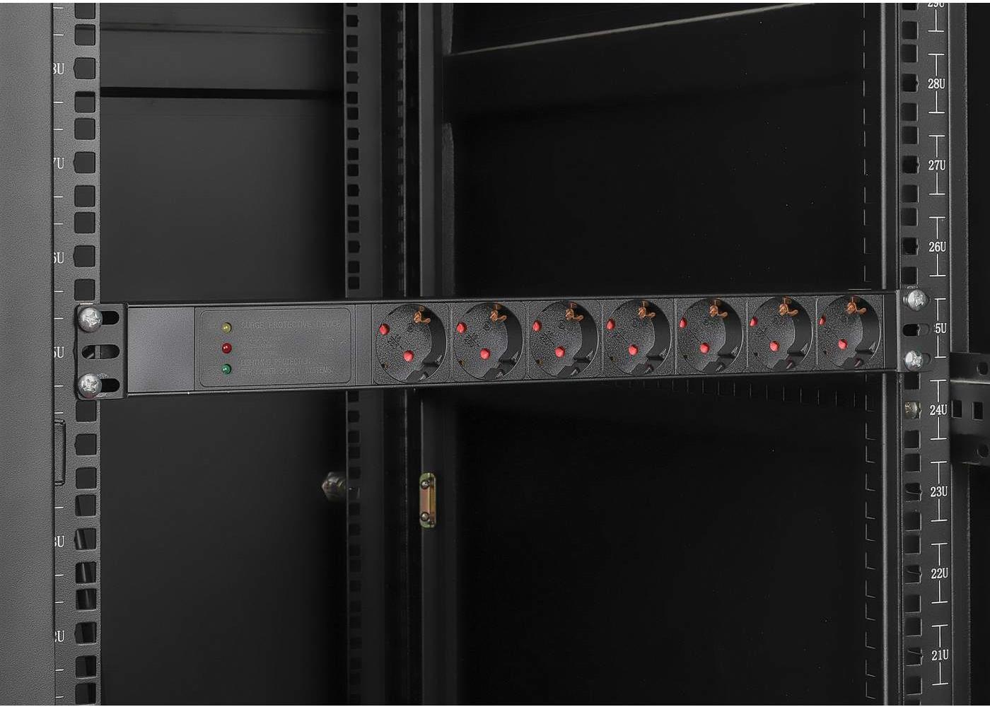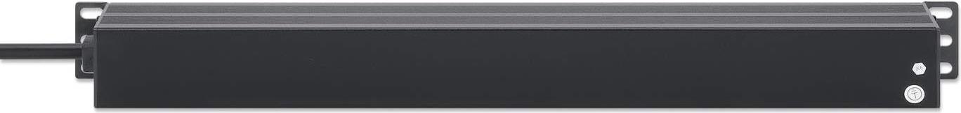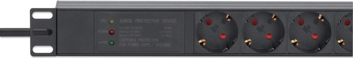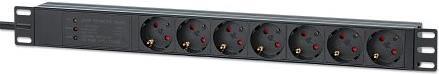 INTELLINET 48,30cm (19") 7-fach Steckdosenleiste / PDU, Schutzkontakt, 1 HE, mit Überspannungsschutz EU CEE 7/3-Steckdosen, 500 Joule/19.500 A Überspannungsschutz, integriertes 3 m Stromkabel mit EU CEE 7/7-Stecker, 16 A, horizontale Montage, Aluminium, schwarz (715140)