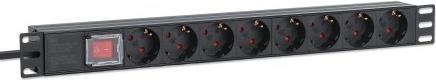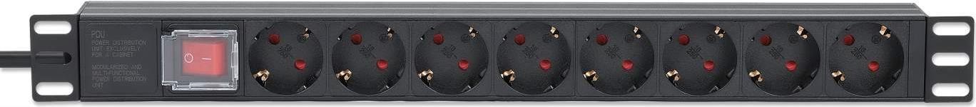 INTELLINET 48,30cm (19") 8-fach Steckdosenleiste / PDU, Schutzkontakt, 1 HE EU CEE 7/3-Steckdosen, integriertes 2 m Stromkabel mit EU CEE 7/7-Stecker, 16 A, Netzschalter, horizontale Montage, Aluminium, schwarz (715126)
