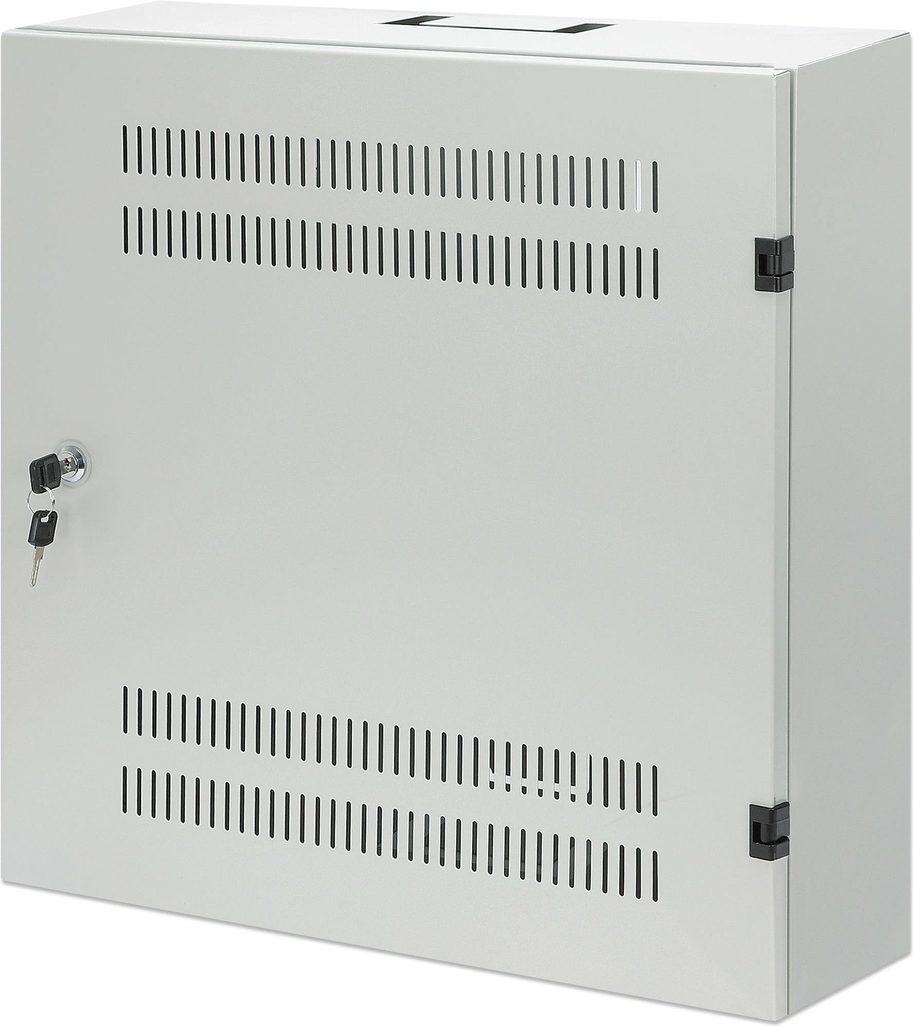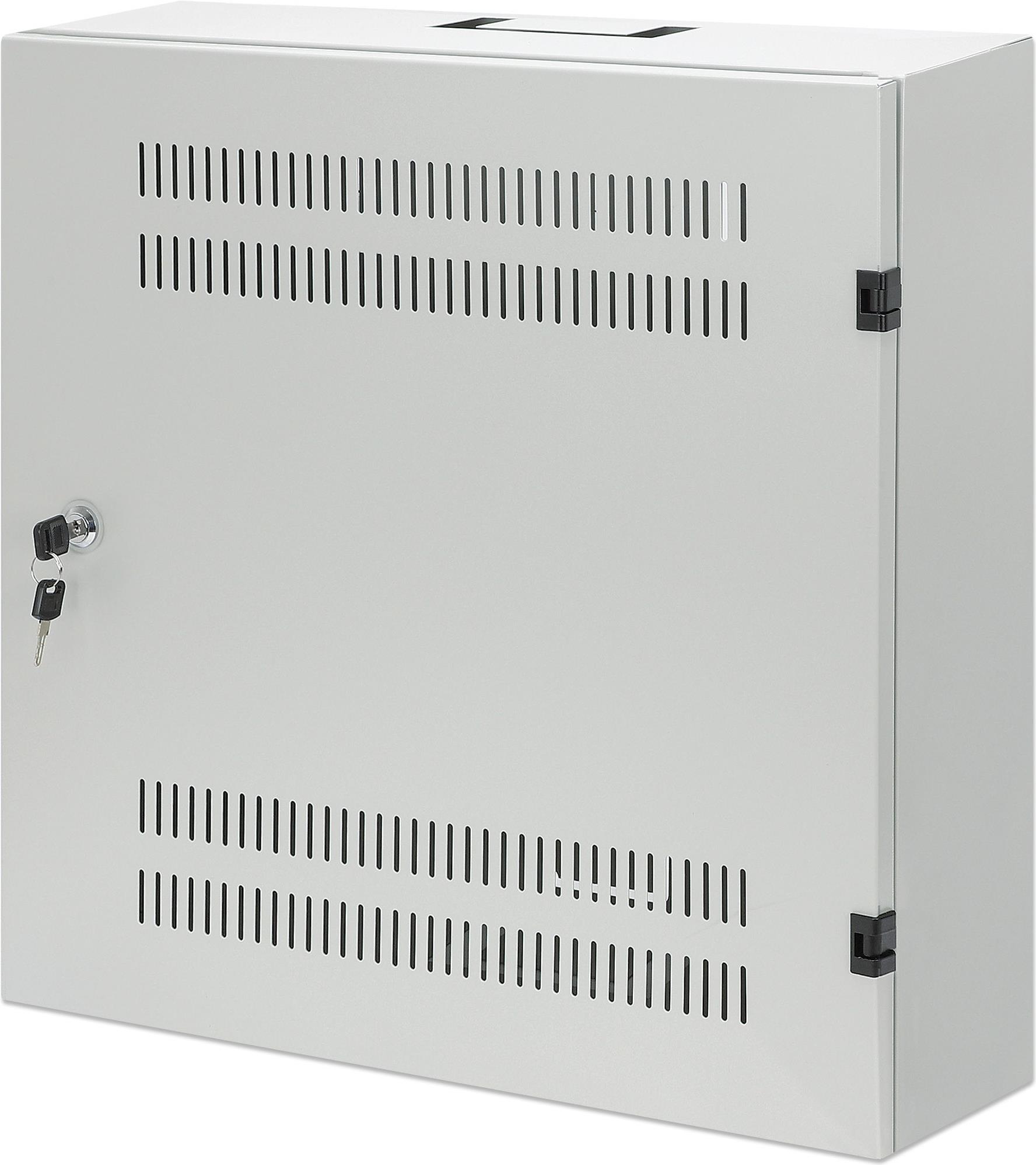 Schlankes, platzsparendes Netzwerk-Wandgehäuse-Rack für AV-Multimedia-Geräte und mehr Der Low-Profile 19"-Wandschrank mit horizontalen 4U- und vertikalen 2U-Schienen von Intellinet Network Solutions ist ein schlankes Rack-Gehäuse für Wohn- und SOHO-Umgebungen. Es organisiert und sichert Netzwerkgeräte aus den Bereichen Multimedia, Überwachung, Audio/Video und Heimautomatisierung und spart durch die Kombination von zwei Montageoptionen wertvollen Platz. Dank seiner geringen Tiefe ragt es nur 170 mm aus der Wand heraus, aber dank der vertikalen Montageoption können Sie auch sperrige Geräte wie Netzwerk-Switches mit einer Tiefe von bis zu 280 mm installieren. Das robuste Stahlgehäuse der Schutzklasse IP20 mit antistatischer Pulverbeschichtung kann mit einem sicheren Dreipunkt-Türschloss verriegelt werden, um Beschädigungen, Manipulationen oder Diebstahl zu verhindern. Es kann mit bis zu 60 kg belastet werden, und die Lüftungsschlitze sorgen für einen maximalen Luftstrom, damit Ihre Geräte kühl bleiben. Ihre strukturierte Verkabelung kann durch vorgestanzte Löcher an der Ober-, Rück- oder Unterseite eingeführt werden. Durch den komplett montierten Versandzustand sparen Sie sich die Mühe des Zusammenbaus.