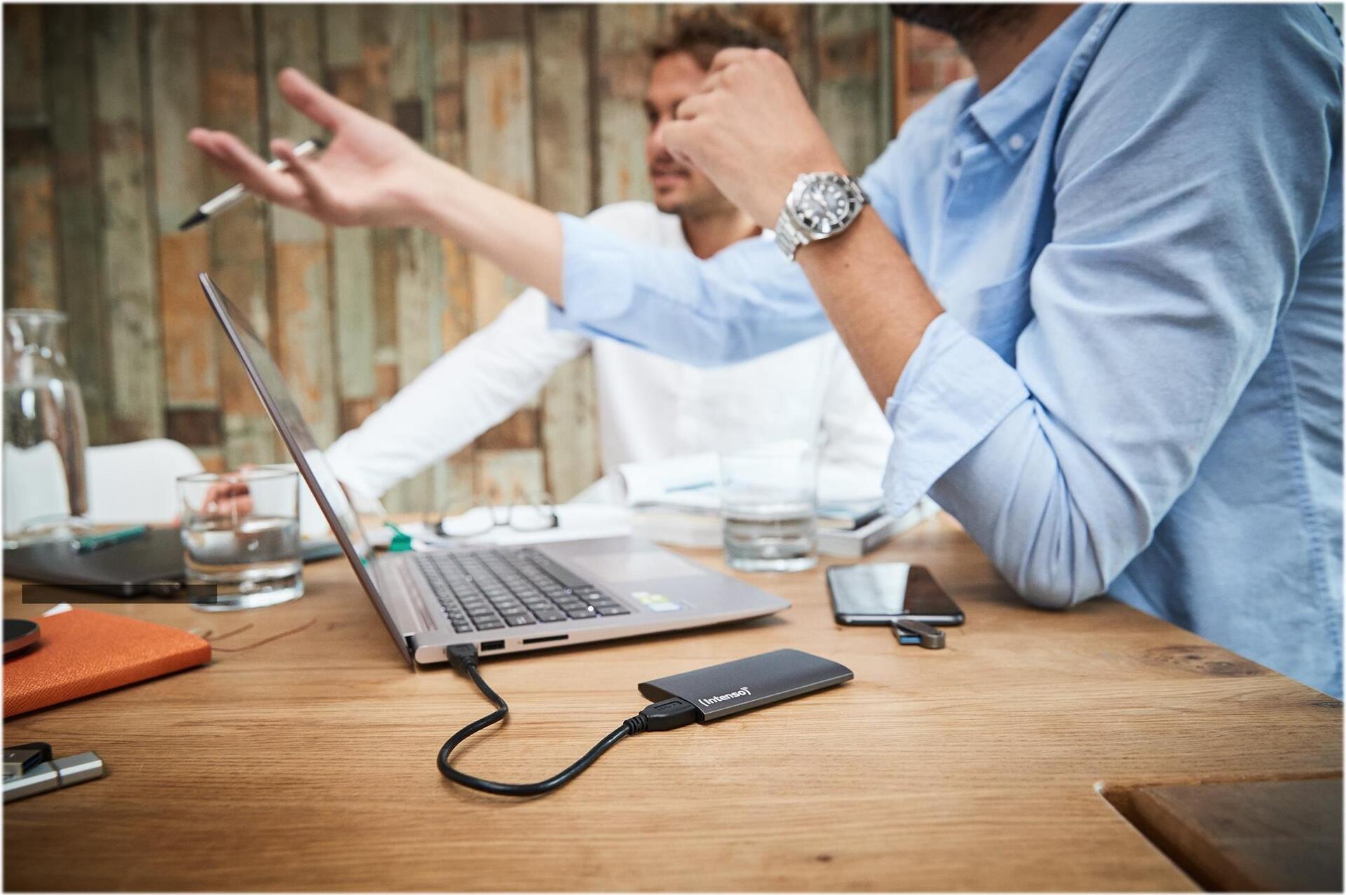 Erleben Sie schnellste Datensicherung im kleinen Format! Mit der externen SSD Premium Edition von Intenso speichern Sie Ihre Daten wie Fotos oder Videos in kürzester Zeit. Dank USB 3.0 Schnittstelle lassen sich sogar größere Datenmengen mit bis zu 320 MB/s übertragen. Auch unterwegs ist die SSD der perfekte Begleiter, denn durch seine kompakte Größe im Scheckkarten Format findet sie in jeder Tasche Platz. Im Gegensatz zu herkömmlichen Festplatten basieren SSDs auf Flash und sind daher stoßunempfindlich und geräuschlos. Zudem sind ihre wertvollen Daten durch ein hochwertiges und robustes Metallgehäuse in anthrazit geschützt. Besonders Hobby Fotografen und Videographen werden an der externen SSD wahre Freude haben, da ihre speicherintensiven Daten schnell und zuverlässig gesichert werden können. Schnell und zuverlässig im Premium Design Die SSD Premium Edition ist nicht nur besonders leistungsfähig, sondern überzeugt sowohl optisch als auch im mobilen Gebrauch. Da keine beweglichen Teile verbaut sind, können Erschütterungen der SSD nichts anhaben. Außerdem wird der Speicher von einem strapazierfähigen und hochwertigen Design aus Metall geschützt. Hohe Performance im kleinen Format Dank USB 3.0 erreicht die SSD Premium Edition Übertragungsgeschwindigkeiten von bis zu 320 MB/s. So lassen sich auch größere Datenmengen in kürzester Zeit übertragen. Auch unterwegs, im Urlaub oder auf Geschäftsreise, ist die SSD der optimale Begleiter. Das Format der SSD mit Maßen von 89,5 x 53,8 x 9 mm und einem Gewicht von nur 50 g ist klein und handlich und lässt sich bequem transportieren.