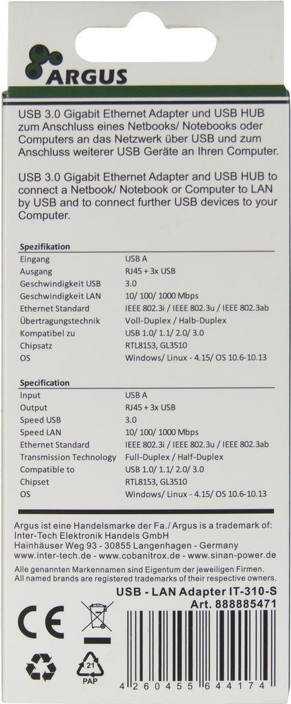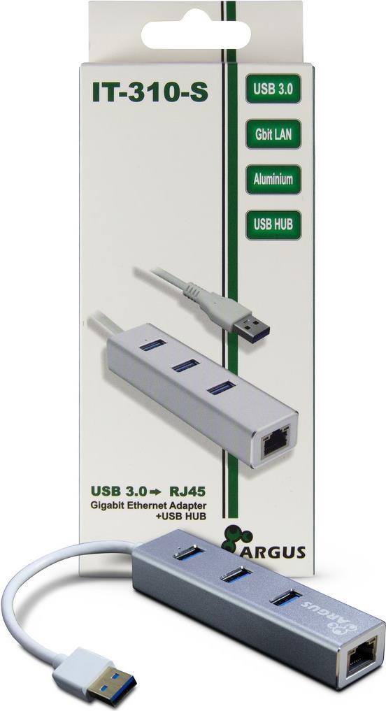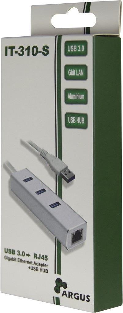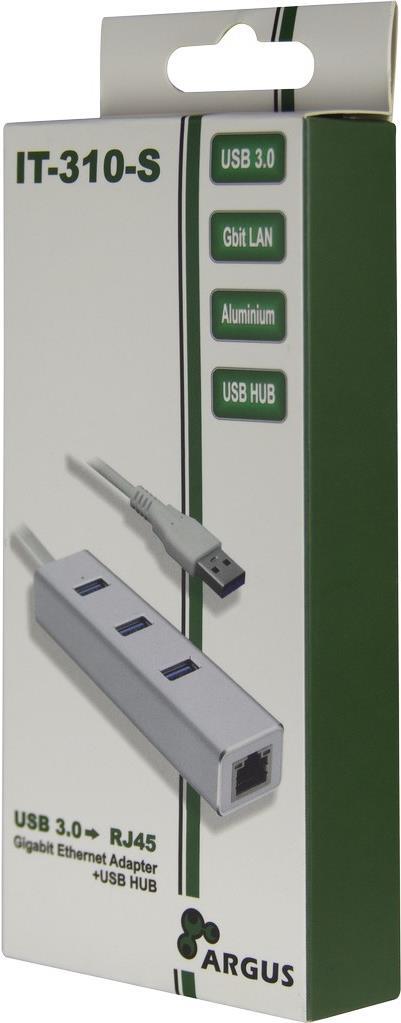 Der ARGUS IT-310-S LAN-Adapter schafft eine Verbindung zwischen Ihrem Netzwerk und einer freien USB-3.0-Schnittstelle Ihres Notebooks/Computers.Neben dem sofort einsatzbereiten RJ45-Netzwerkanschluss bietet der IT-310-S zudem noch einen dreifach USB 3.0 USB-Hub. Das Gehäuse besteht aus Aluminium und setzt mit seiner Lackierung und polierten Kanten auch optische Akzente.Produkttext[/head]Der ARGUS IT-310-S LAN-Adapter schafft eine Verbindung zwischen Ihrem Netzwerk und einer freien USB 3.0-Schnittstelle Ihres Notebooks/Computers.Neben dem sofort einsatzbereiten RJ45-Netzwerkanschluss bietet der IT-310-S zudem noch einen dreifach USB 3.0 USB-Hub. Das Gehäuse besteht aus Aluminium und setzt mit seiner silbernen Lackierung und polierten Kanten auch optische Akzente.[head]Hauptmerkmale