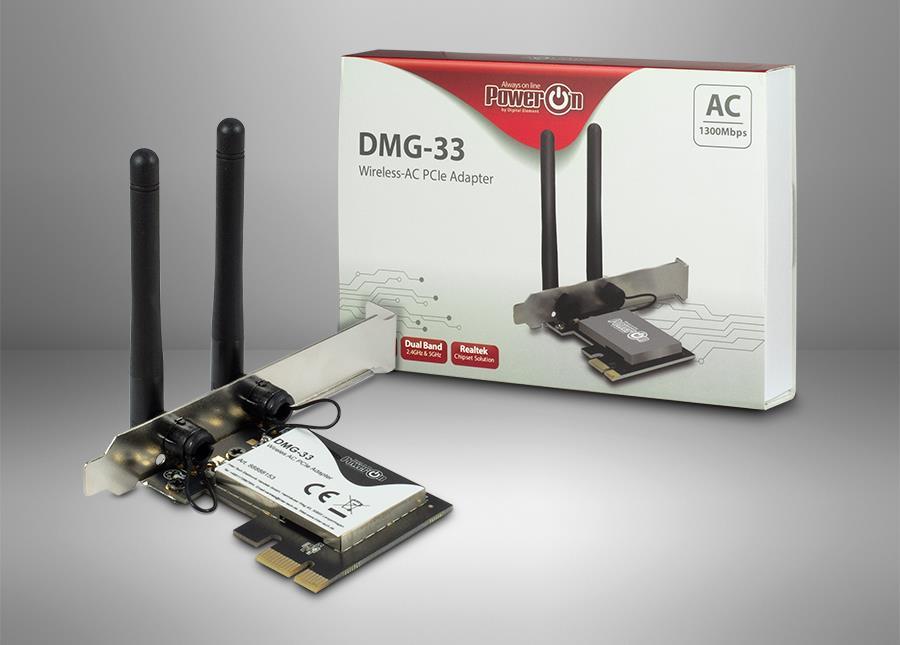 Der DMG-33 von PowerOn verbindet Desktops mit einem High-Speed WLAN-Netzwerk. Er ist kompatibel mit den 802.11a/b/g/n/ac (WiFi 5) Standards und erreicht Geschwindigkeiten von bis zu 1300 Mbps im 2,4 GHz oder 5 GHz Netz über einen freien PCIe x1 Port.Die zwei leistungsstarken 3 dBi Antennen sorgen nicht nur für einen ordentlichen Datendurchsatz, sondern gewährleisten auch eine unterbrechungsfreie Datenübertragen auf größere Distanzen.Produkttext[/head]Der DMG-33 von PowerOn verbindet Desktops mit einem High-Speed WLAN-Netzwerk. Er ist kompatibel mit den 802.11a/b/g/n/ac (WiFi 5) Standards und erreicht Geschwindigkeiten von bis zu 1300Mbps im 2,4GHz oder 5GHz Netz, über einen freien PCIe x1 Port.Die zwei leistungsstarken 3dBi Antennen sorgen nicht nur für einen ordentlichen Datendurchsatz, sondern gewährleisten auch eine unterbrechungsfreie Datenübertragen auf größere Distanzen.[head]Hauptmerkmale