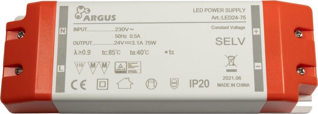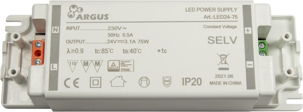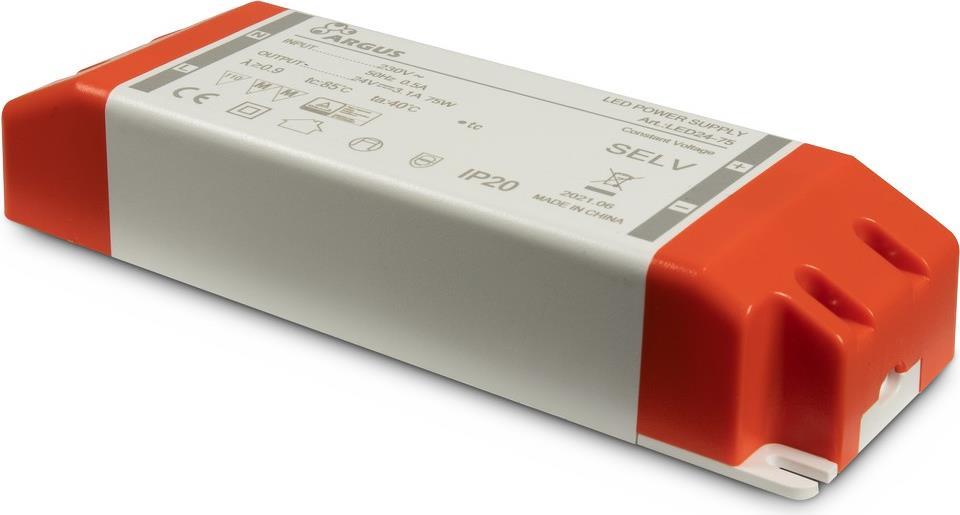 Der LED24-75 ist ein 75 W starker LED Driver mit 24 V Ausgangsspannung bei 3100 mA. Er ist ausgestattet mit fünf Schutzschaltungen zur Absicherung der angeschlossenen Komponenten, hat eine MTBF von 100.000 Stunden und ist mit der Schutzklasse IP20 zertifiziert.