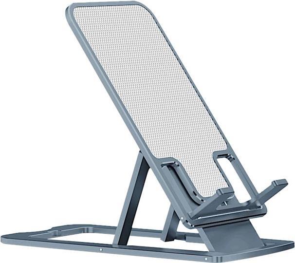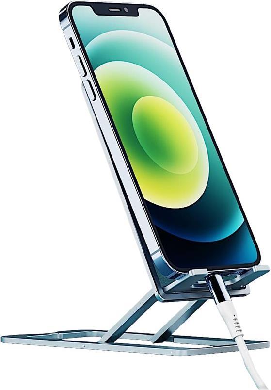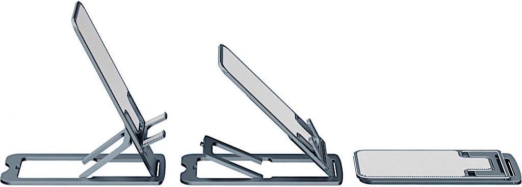 Die faltbare Halterung MTS-100 bietet allen Mobiltelefonen und Tablets, bis zu einer Größe von 12" und 800g, einen sicheren Stand und lässt sich in 7 Winkeln von 10°- 60° neigen. Eine Höhenverstellung ist problemlos in 10 Stufen, durch einfaches Schieben, möglich.