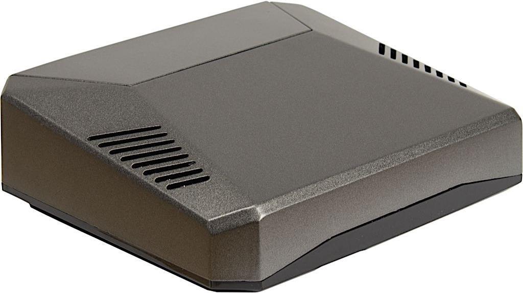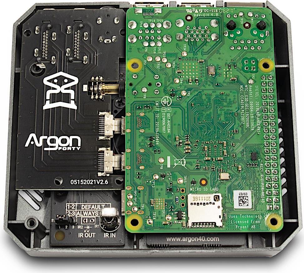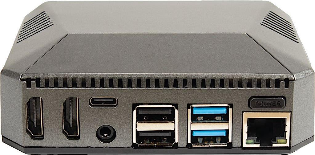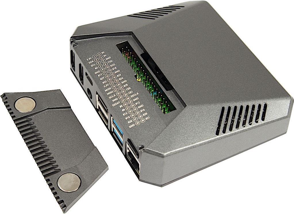 Dank der eingebauten Adapterplatte werden die externen Anschlüsse erweitert und befinden sich so allesamt auf der Rückseite des Gehäuses, was für eine saubere Anordnung sorgt. Zudem werden die GPIO-Pins erweitert, welche hinter einer magnetischen Abdeckung, auf der Oberseite des Gehäuses, frei zugänglich sind. Die Pin-Belegung der GPIOs wurde zudem praktisch unterhalb der Abdeckung aufgedruckt.