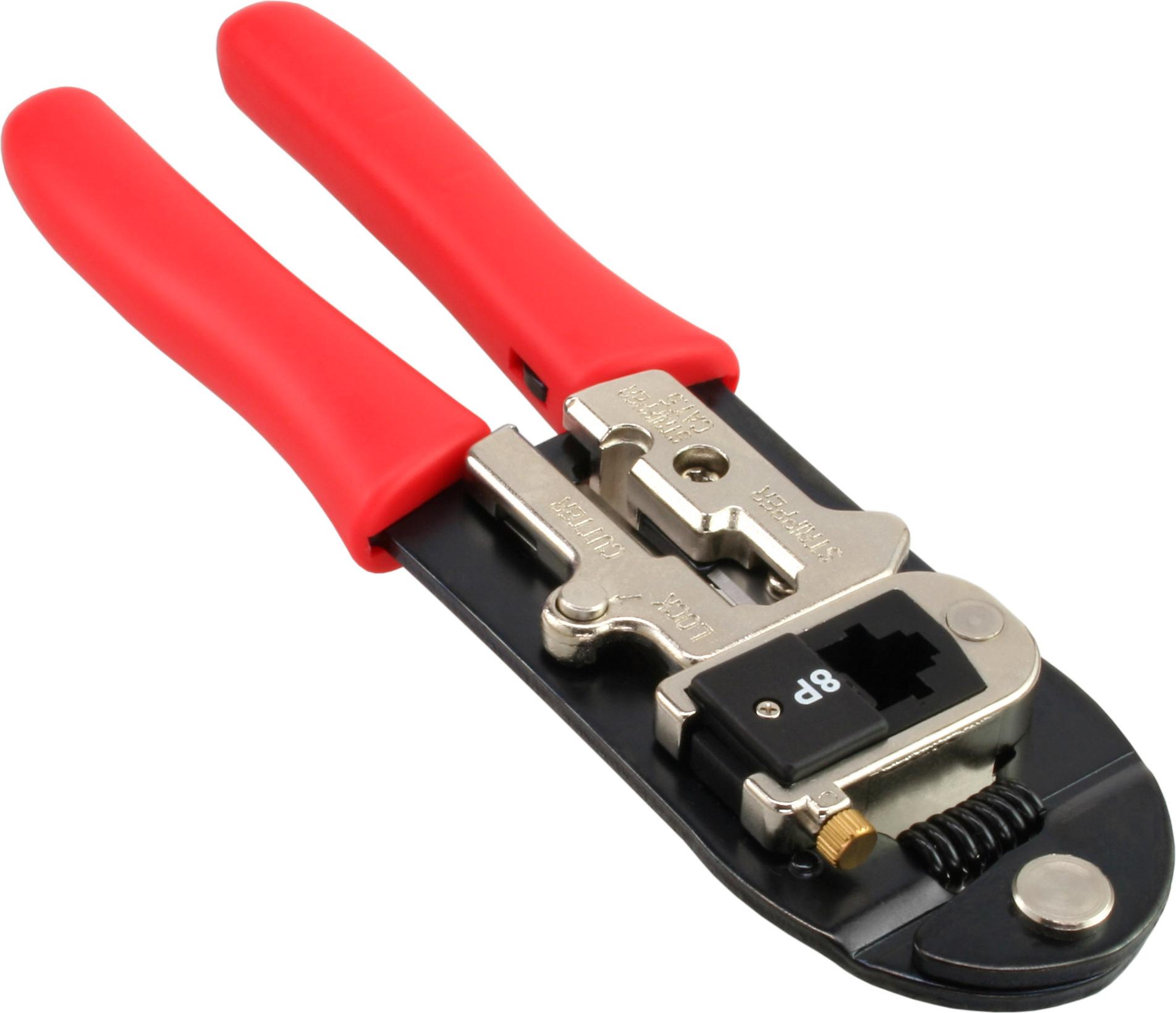Mit dieser Profi Crimpzange ist es möglich Netzwerk Patchkabel und ISDN Telefonkabel (RJ45 / 8P8C) zu Konfektionieren. Mit einem austauschbaren und optional erhältlichem Crimpmodul können auch RJ11/12 (6P6C) oder RJ10 (4P4C) Stecker bearbeitet werden.• Zange für Cat. und Telefon-Flachkabel
