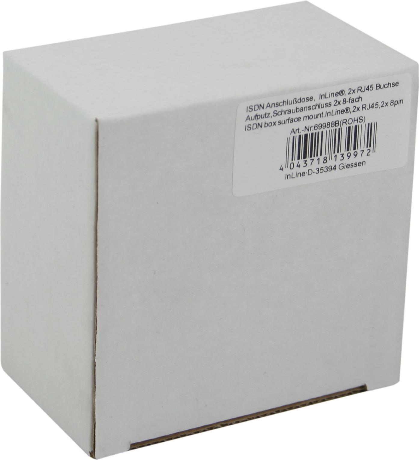 InLine® ISDN Anschlussdose, 2x RJ45 Buchse, Aufputz, Schraubanschluss 2x 8-fach• 2x RJ45 Buchse• Anschlusskabel werden angeschraubt (Schraubleiste)• ohne Endwiderstand• 2x 8polig belegt, getrennt• Aufputz-MontageProdukttext[/head]2x RJ45 Buchse. Anschlußkabel werden angeschraubt (Schraubleiste). ohne Endwiderstand. 2x 8polig belegt, getrennt. Aufputz-Montage.[head]Hauptmerkmale