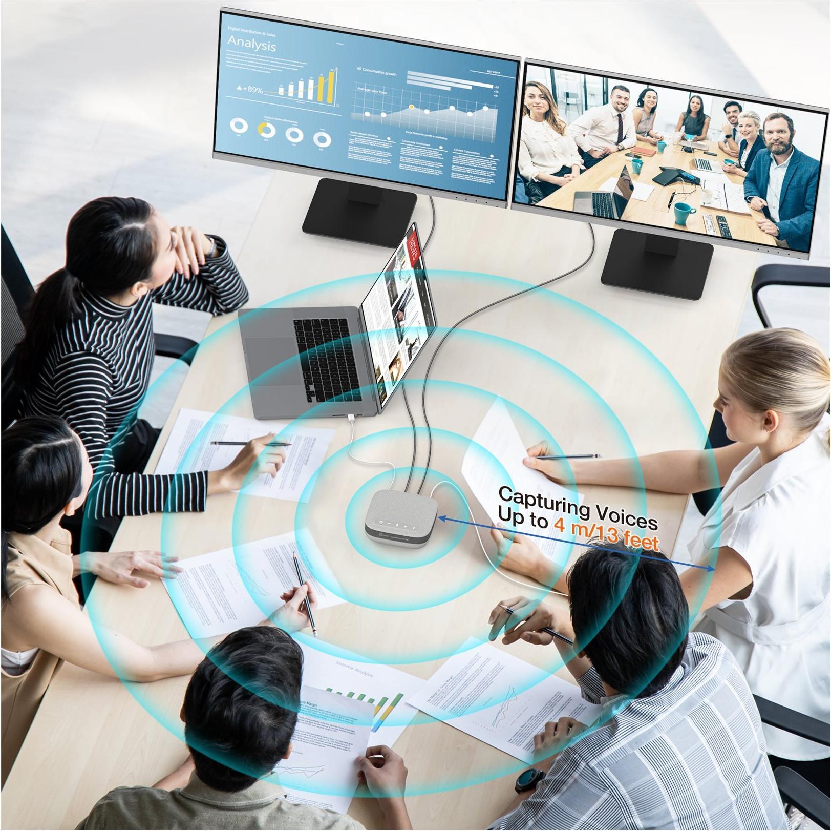 Die USB-C Dual 4K Speakerphone Dock Pro verwandelt Ihr Laptop in eine vollwertige Arbeitsstation und Konferenzgerät. Sie verfügt über zwei 4K HDMI-Ausgänge und einen Type-C Power In-Anschluss, der bis zu 100W Power Delivery für das Laden von Laptops mit einem Type-C-Netzteil unterstützt. Ausserdem hat sie zwei USB Type-A 10Gbps-Anschlüsse und einen USB-C 10Gbps-Anschluss, um eine Vielzahl von USB-Geräten anzuschliessen. Die Dockingstation ist zudem mit einem RJ45 Gigabit Ethernet-Anschluss für eine Hochgeschwindigkeits-Netzwerkverbindung ausgestattet. Die Lautsprecher- und Mikrofonfunktion sorgt für kristallklaren Audio bei Konferenzgesprächen. Vier omnidirektionale Mikrofone sind enthalten, um Stimmen rund um den Konferenztisch aufzunehmen und verwenden eine akustische Echokompensation, um Echo und unerwünschte Hintergrundgeräusche zu eliminieren. Die integrierten Tasten erleichtern das Initiieren von Anrufen, das Auflegen, Stummschalten/Wiederherstellen und das Anpassen der Lautstärke. Die Speakerphone-Dock ist klein und leicht, was eine einfache Platzierung und den Transport ermöglicht. Sie ist plug-and-play und sofort einsatzbereit mit Ihren bevorzugten Video-Konferenz-Apps. Alle Docking- und Speakerphone-Funktionen sind in einer kompakten Dockingstation vereint, sodass Sie alle Verbindungen haben, die Sie benötigen, um produktiv zu bleiben!