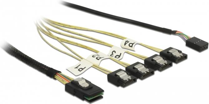 Dieses SAS Kabel von Delock kann zum internen Anschluss von verschiedenen SAS Geräten verwendet werden, z. B. von einem Kontroller mit Mini SAS Anschluss an 4 HDDs mit SATA Anschlüssen.